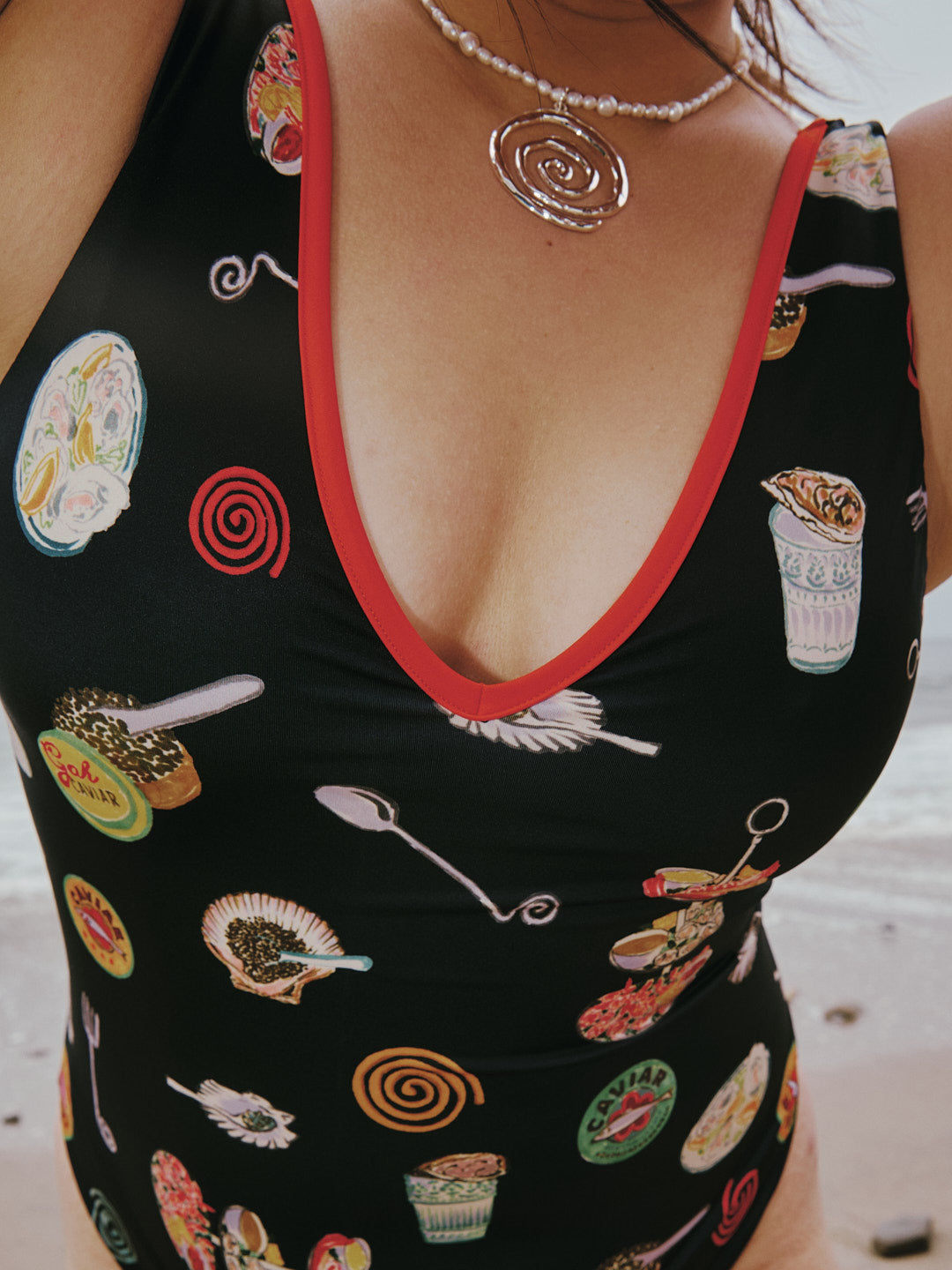 One-piece swimsuit with a deep v-neck and back. Featured in our signature Caviar Dreams print in a double layered fabric for an extra secure fit and red trim.