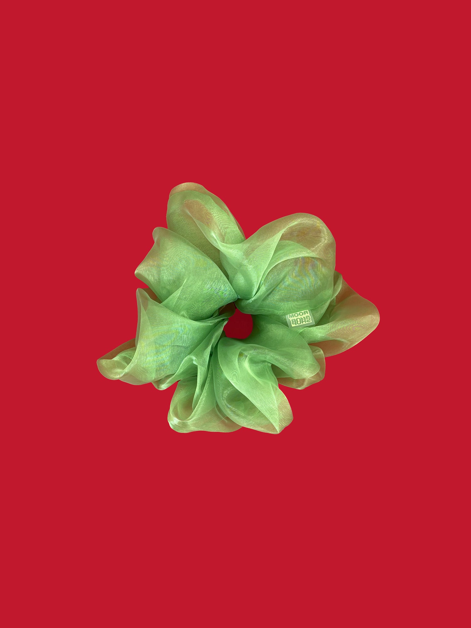We love the drama! Room Shop's iconic oversized scrunchie in a green organza fabric. 9" in diameter, this scrunchie is oversized for a fun fit.