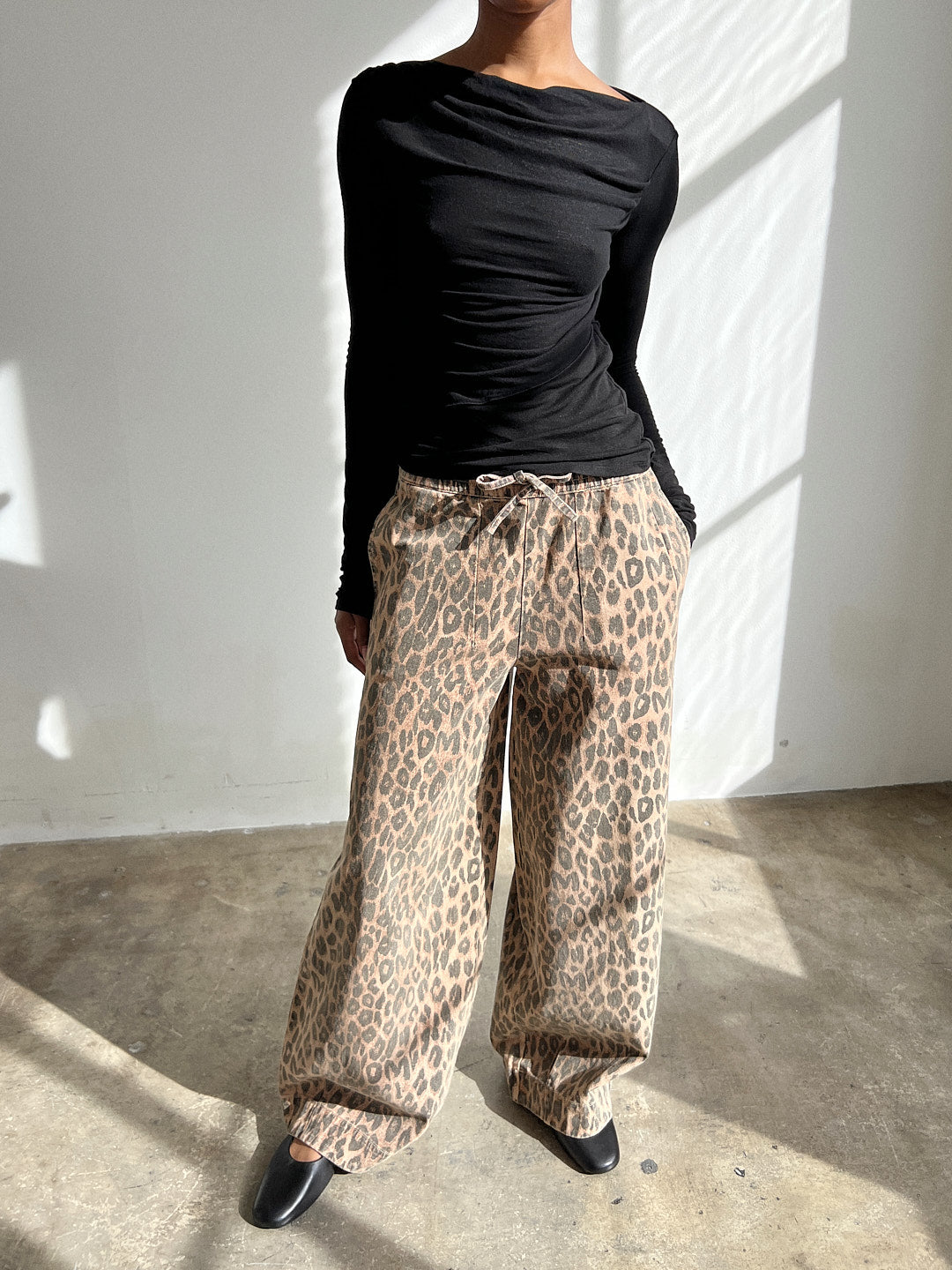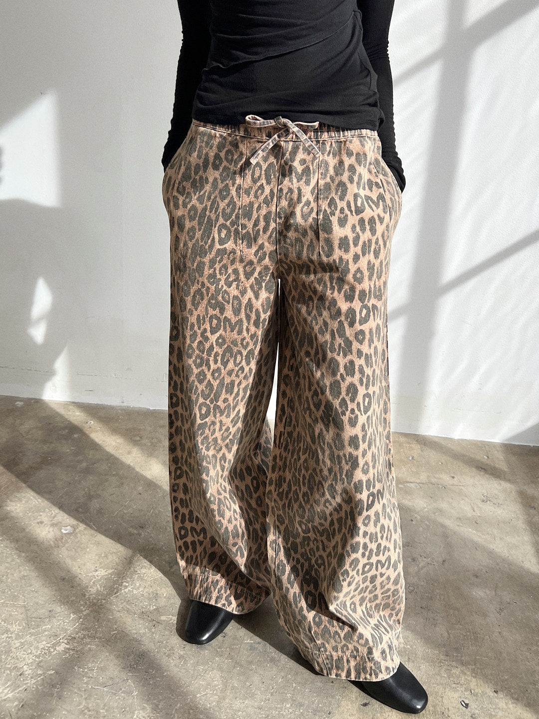 The Good Nature Rafe Pant features an adjustable waist tie, leopard print, and a wide legged silhouette.