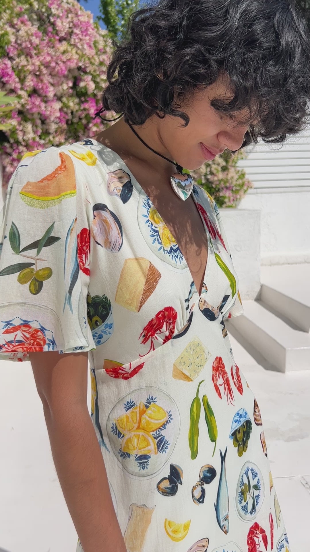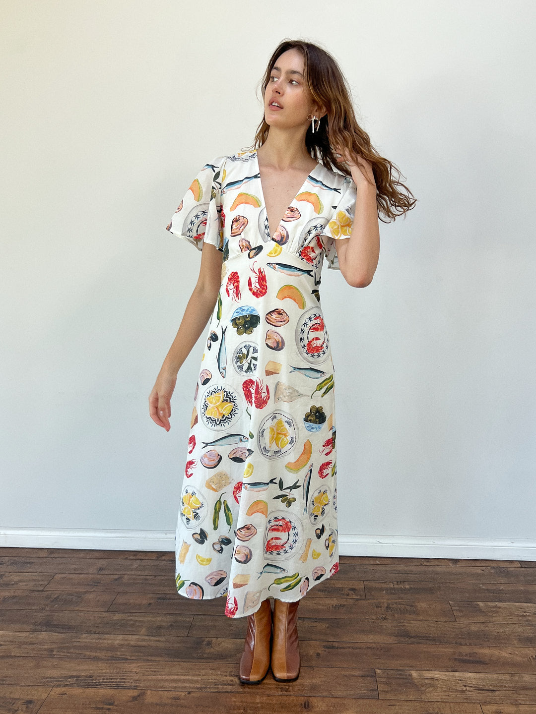 V-neck flutter sleeve midi dress in a breezy linen blend fabric in the Tapas Collection food print. Features a back zip.