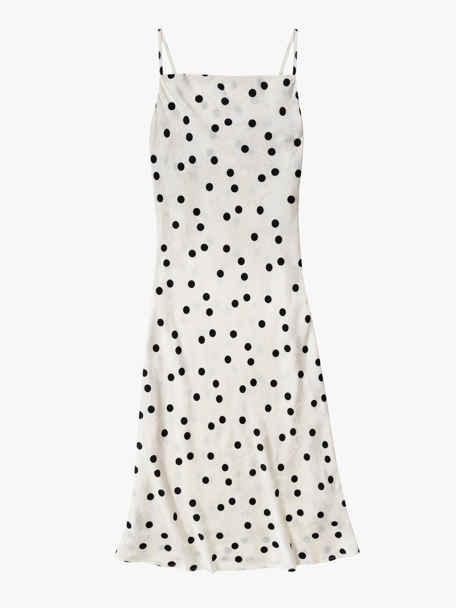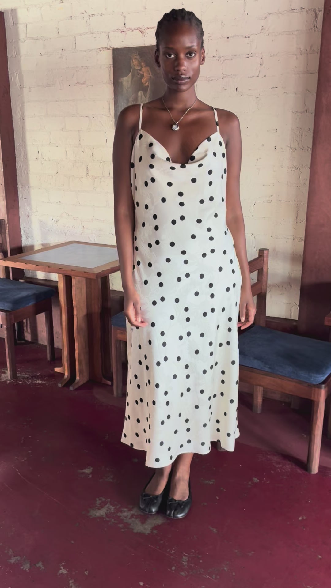 Introducing the Griffin Dress: A slip-style midi dress with spaghetti straps, featured in our signature white dot print and a cowl neck. Lined with adjustable straps.