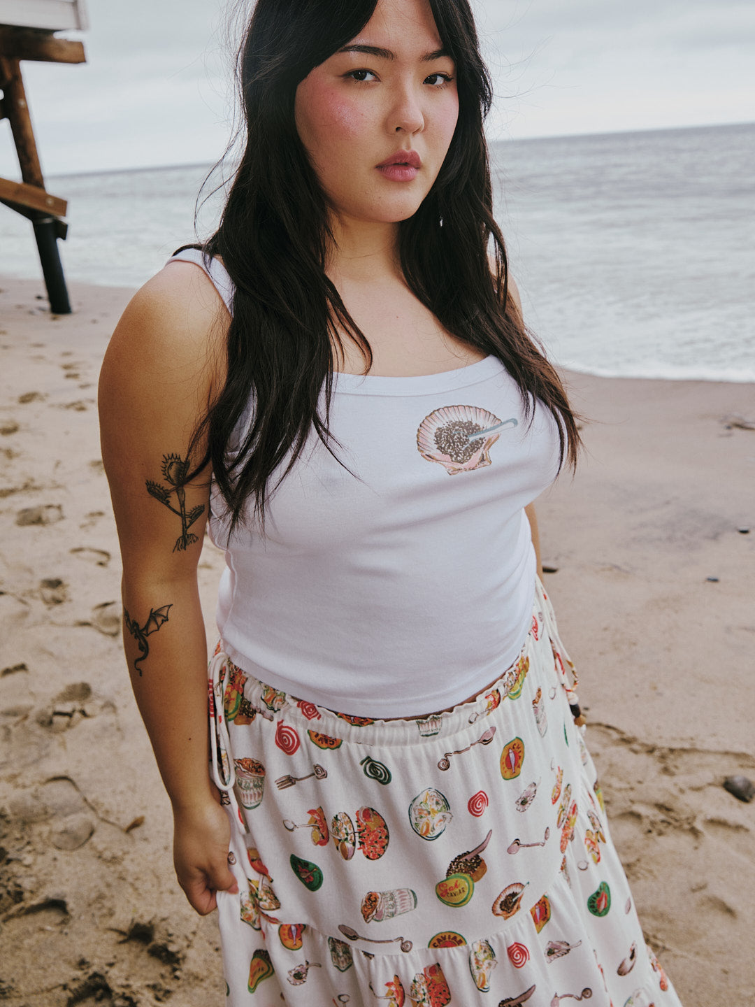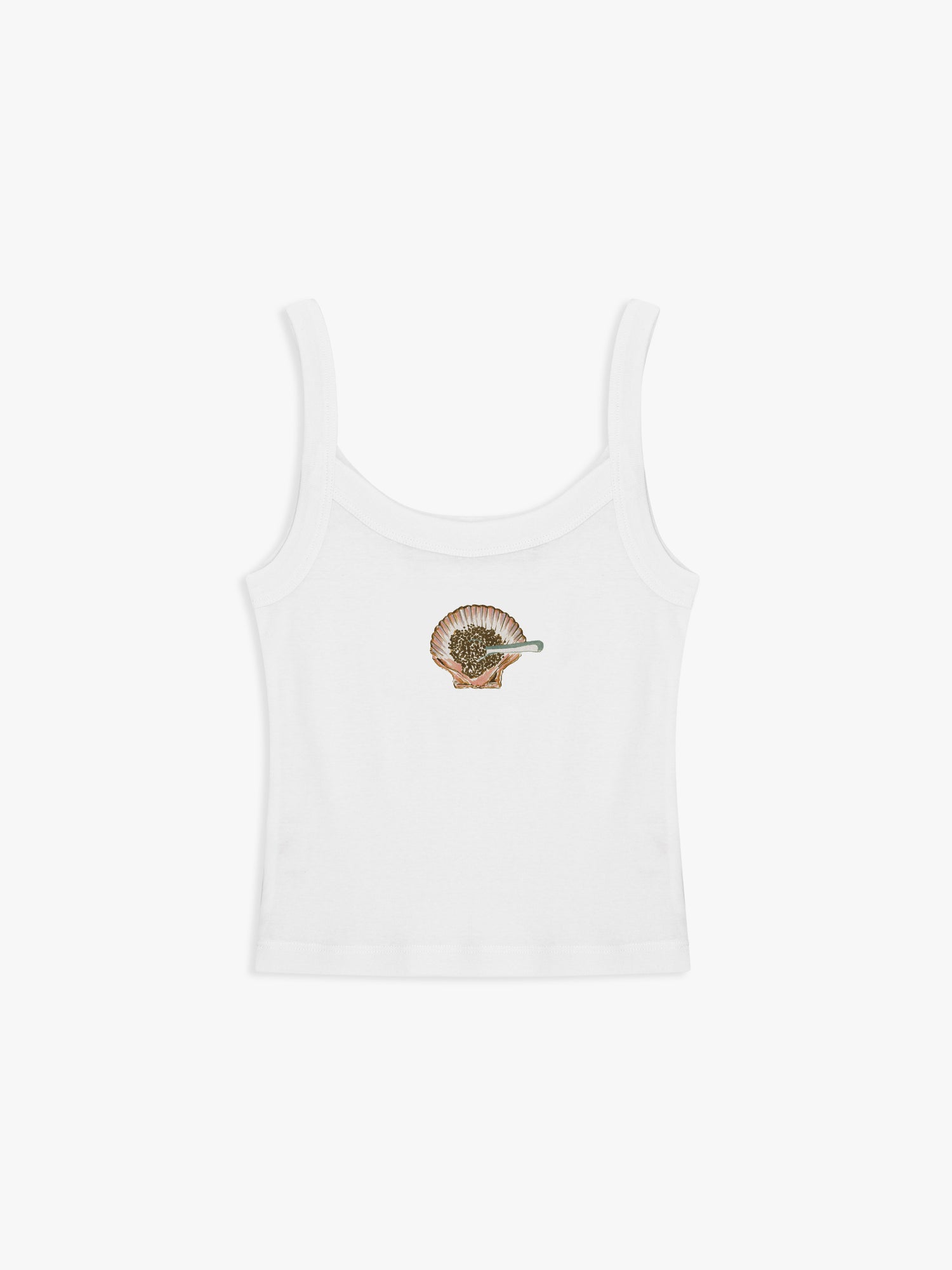Spaghetti strap tank top in soft, cotton t-shirt fabric featuring a Caviar Shell print at front.