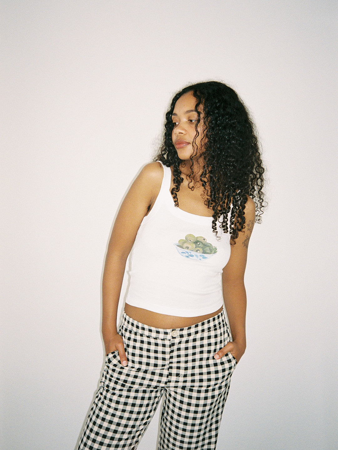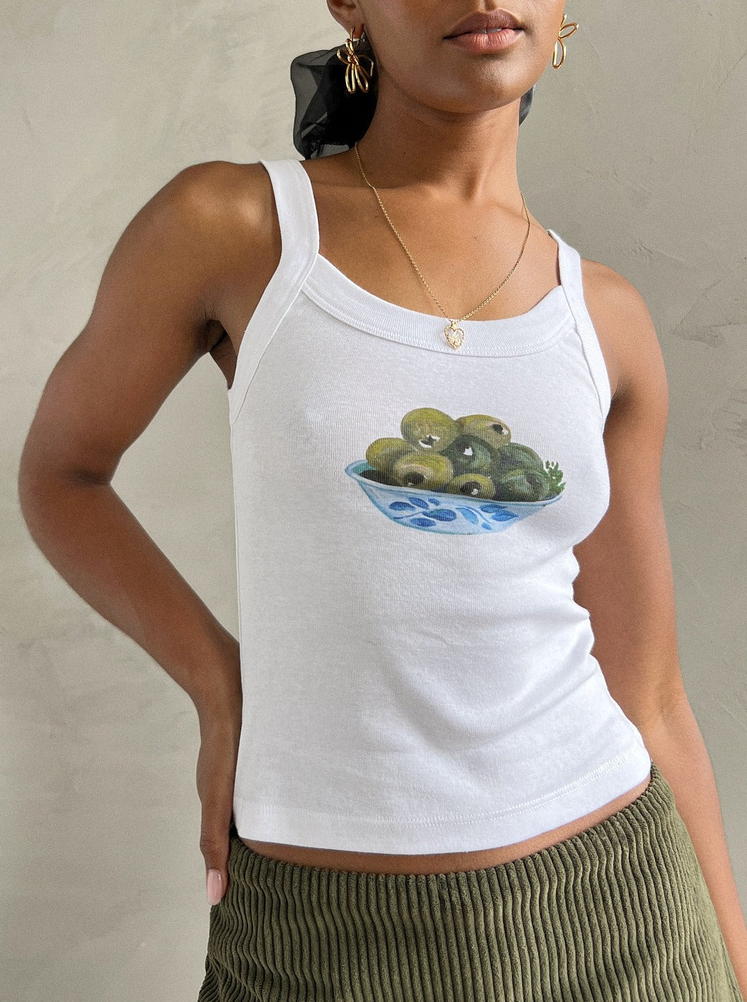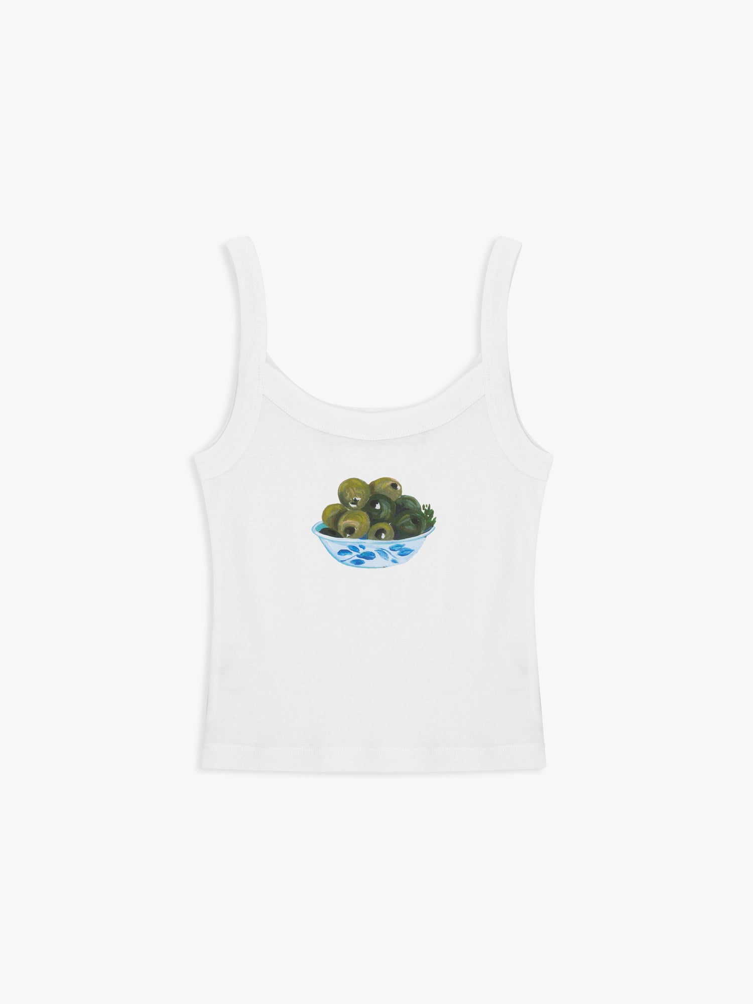Spaghetti strap tank top in soft, cotton t-shirt fabric featuring olive bowl print on front.