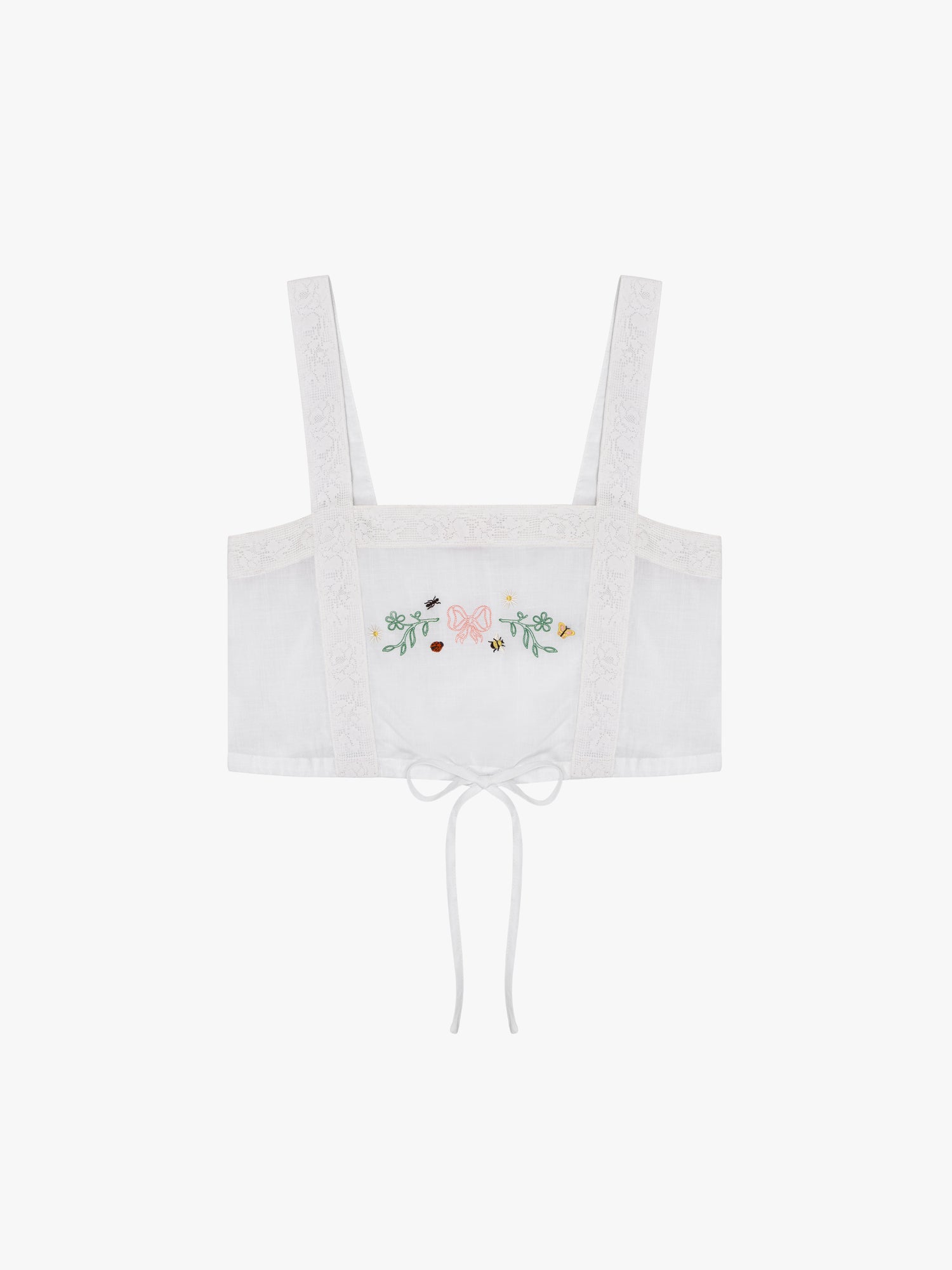 Cotton blend tank top with a drawstring hem for a versatile fit. This top features lace at the straps and our signature garden embroidery at the bust.