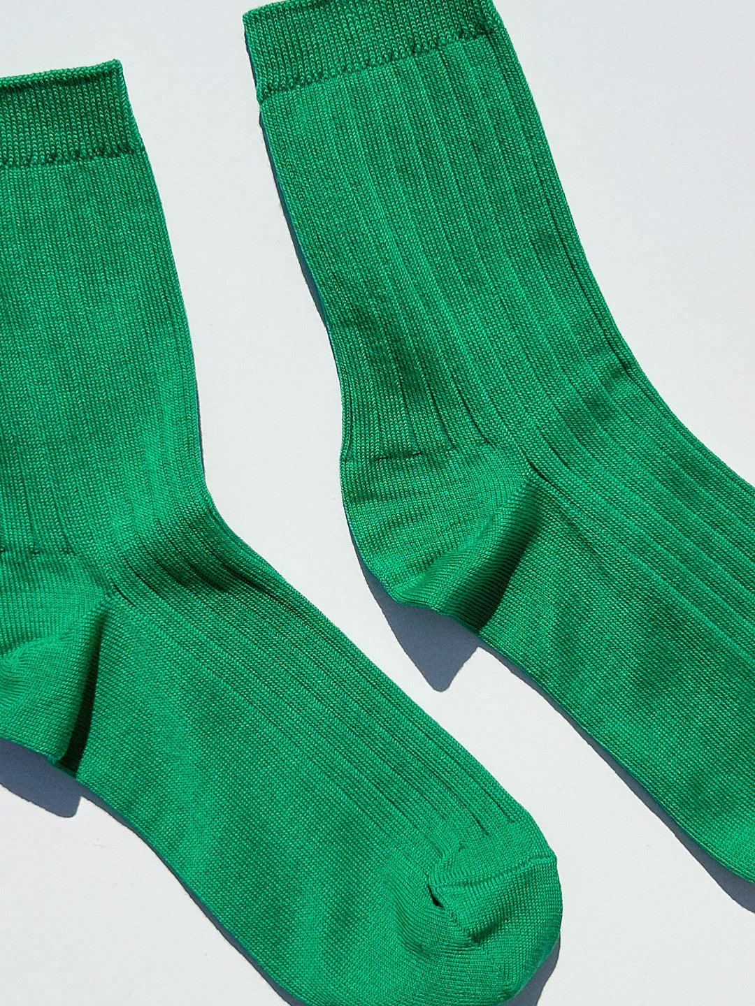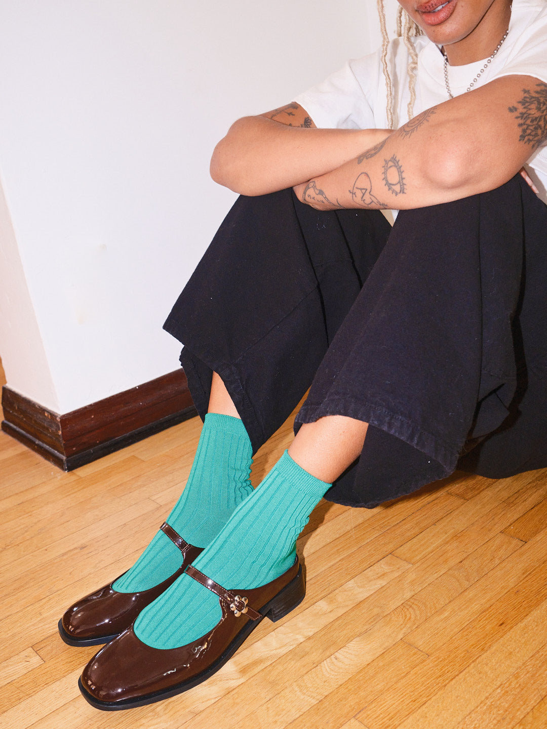 A classic pair of ankle length rib knit socks in a cotton poly blend with a slight sheen.
