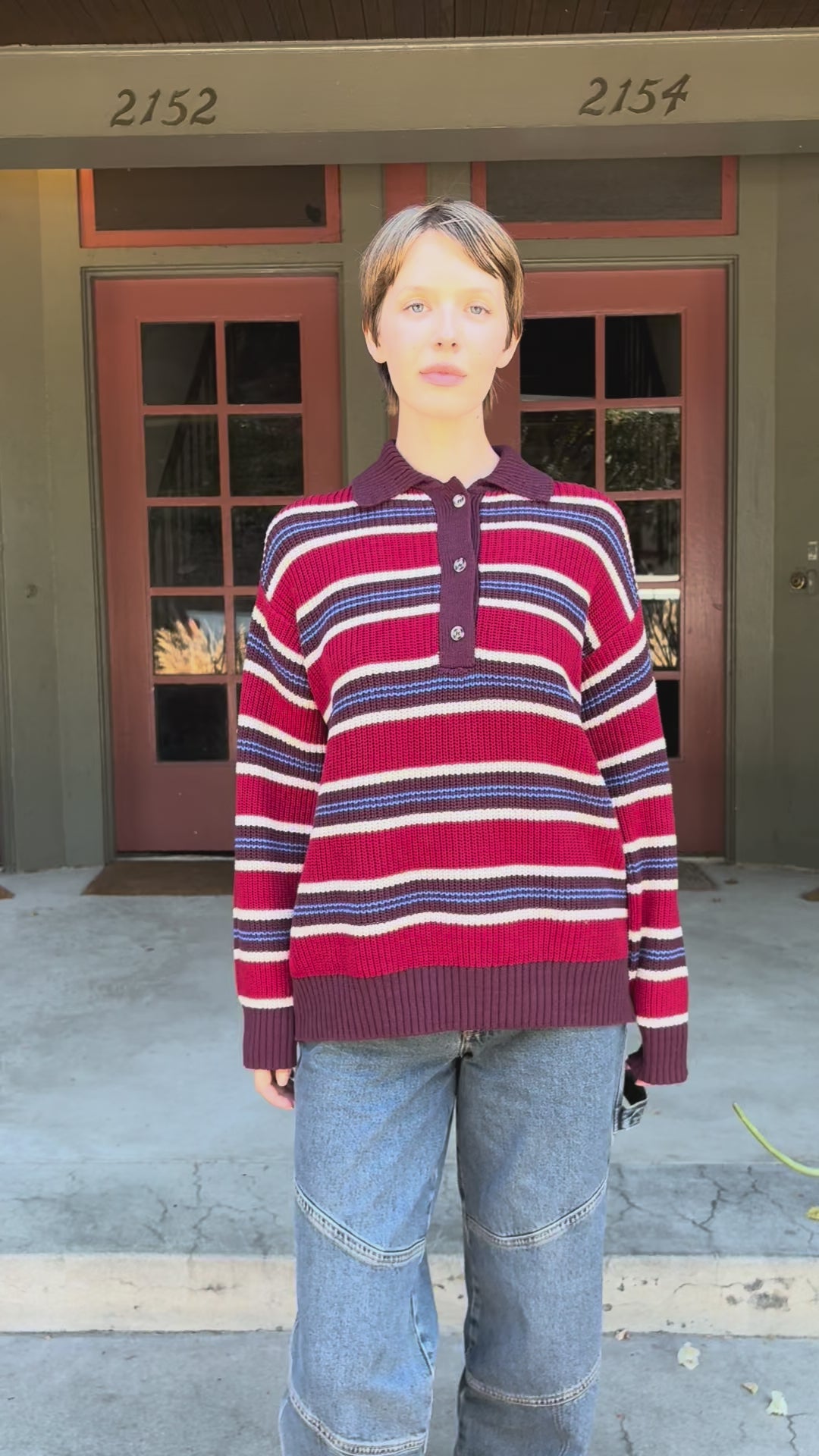 Rugby style sweater featured in a red, blue, and burgundy stripe featuring a front button down placket and an embroidered 'DM' logo.