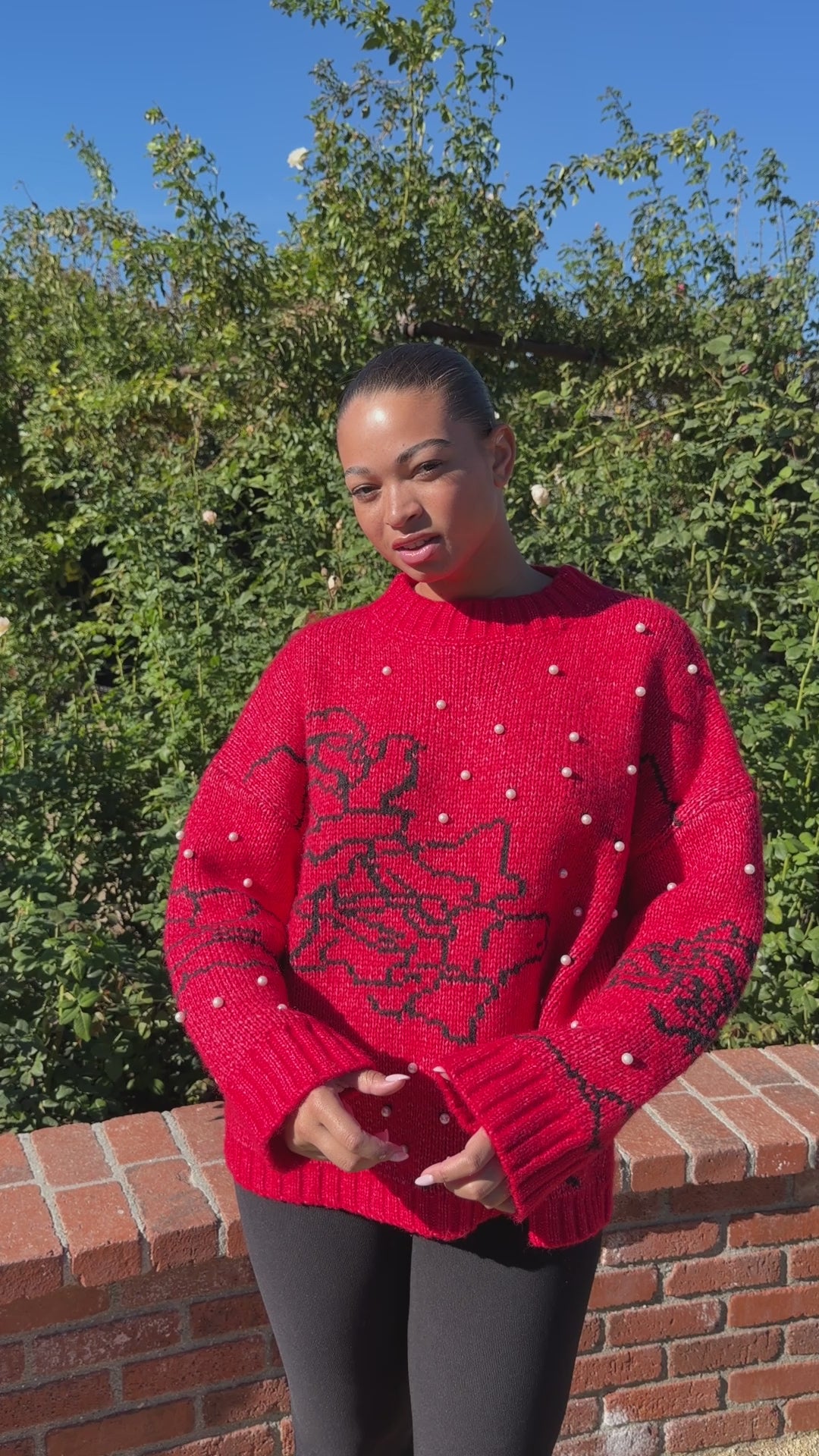 Introducing the Iris Pearl Sweater: This bright red sweater features a crew neckline and an oversized fit with pearl accents throughout and our signature rose pattern. This cozy sweater will keep you warm all winter long.