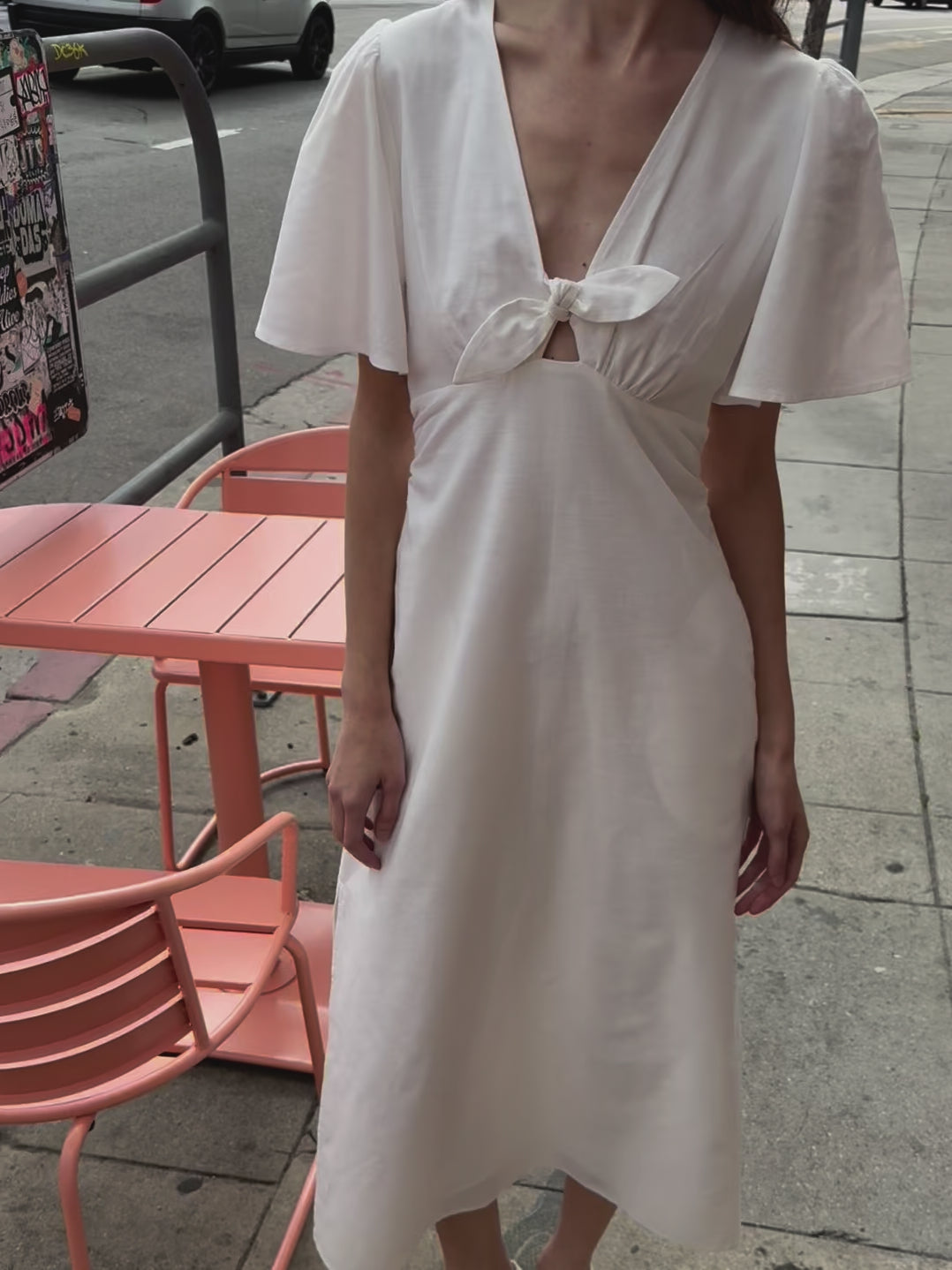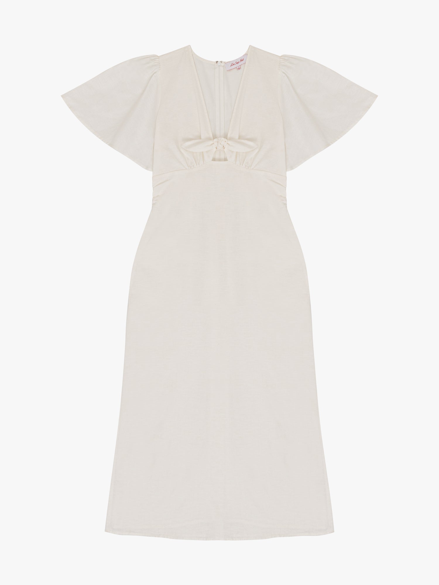 Midi dress featured in a linen blend fabric. This dress has a side slit and fluttery sleeves. This dress has a beautiful v-neckline that ties at front. Fully lined. Side-zip closure.