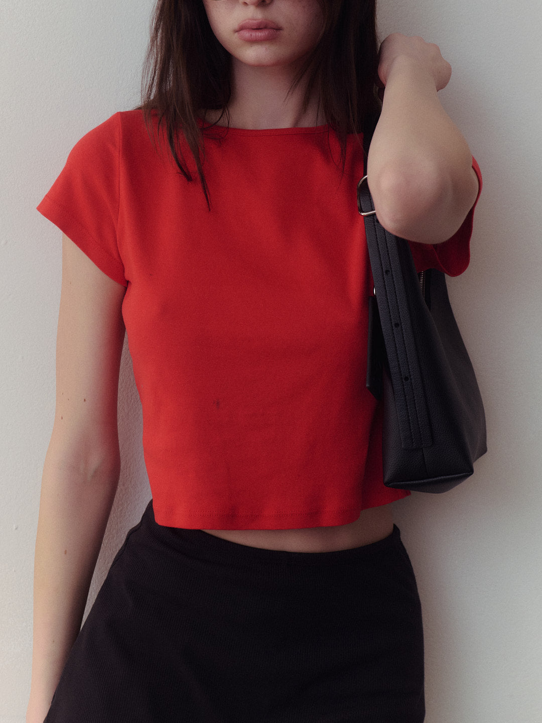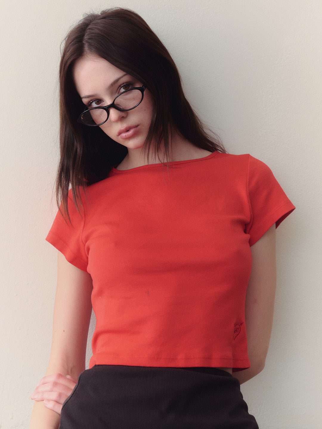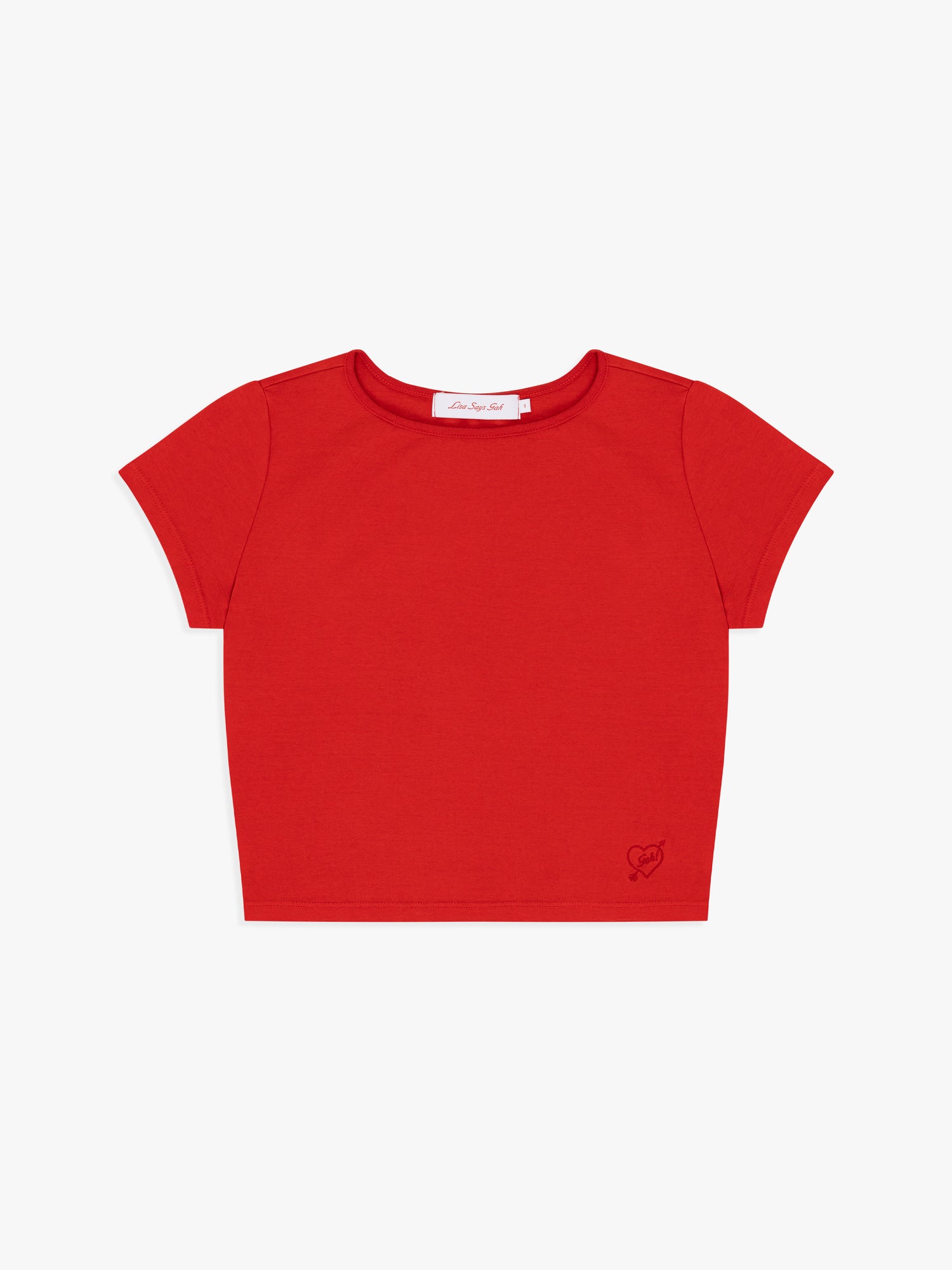 Red cotton tee with a boxy, cropped silhouette. Made to have a vintage-feel.