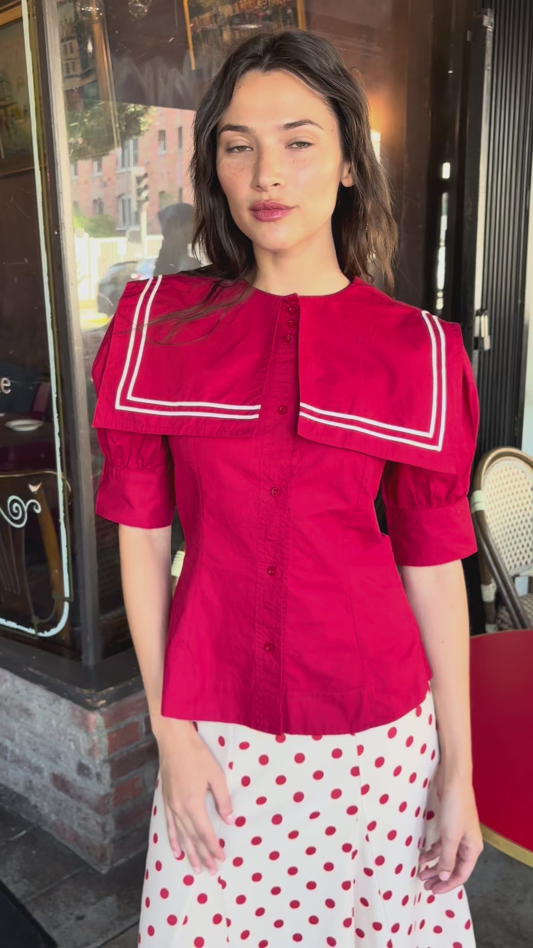 Introducing the Keisha Blouse in Cherry Red from Damson Madder—a playful pop of color for any outfit! This top features an oversized sailor collar and a classic button-down front, balanced by a fitted waist for a flattering shape. Crafted from 100% organic cotton with a short bubble sleeve. True to size—select your usual fit..
