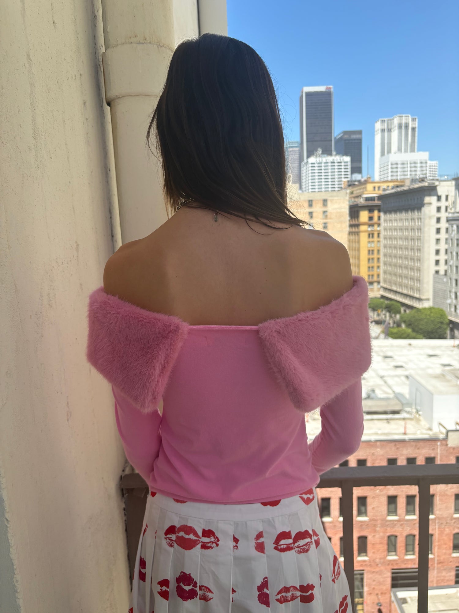 The Kiki Top from Tyler McGillivary is flirty, bold, and unapologetically fun. Designed in a vibrant pink, this off-the-shoulder piece features a plush faux-fur neckline that instantly turns up the drama. With its fitted silhouette and playful texture contrast, the Kiki Top channels retro glam while staying effortlessly wearable