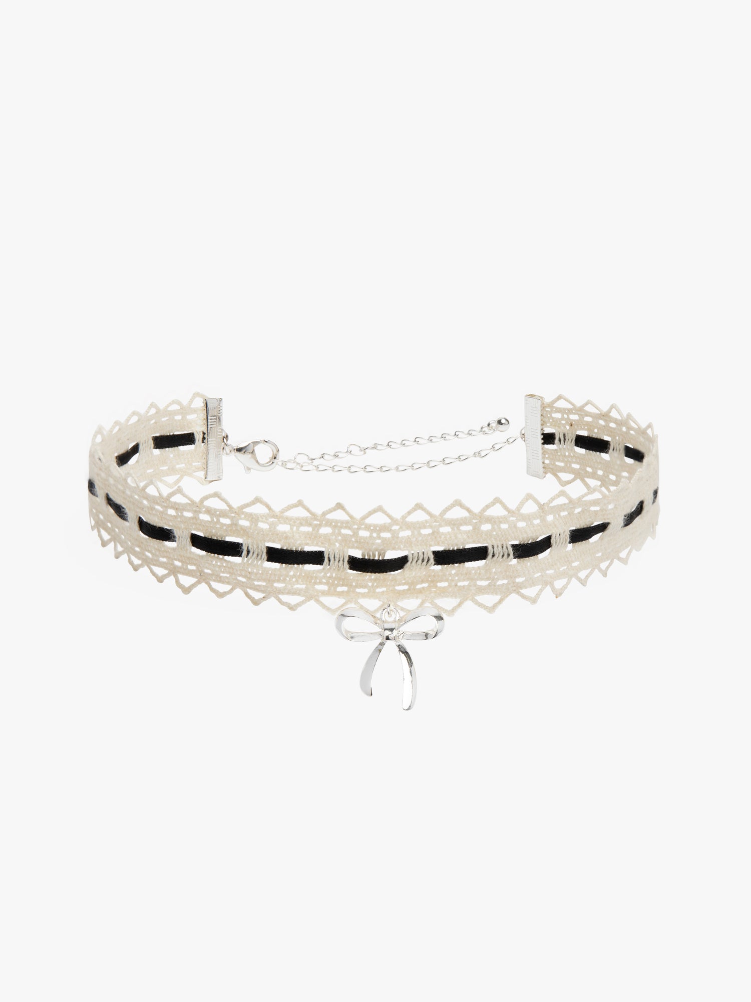 Adorable cream lace choker necklace, features black ribbon details and a silver bow charm