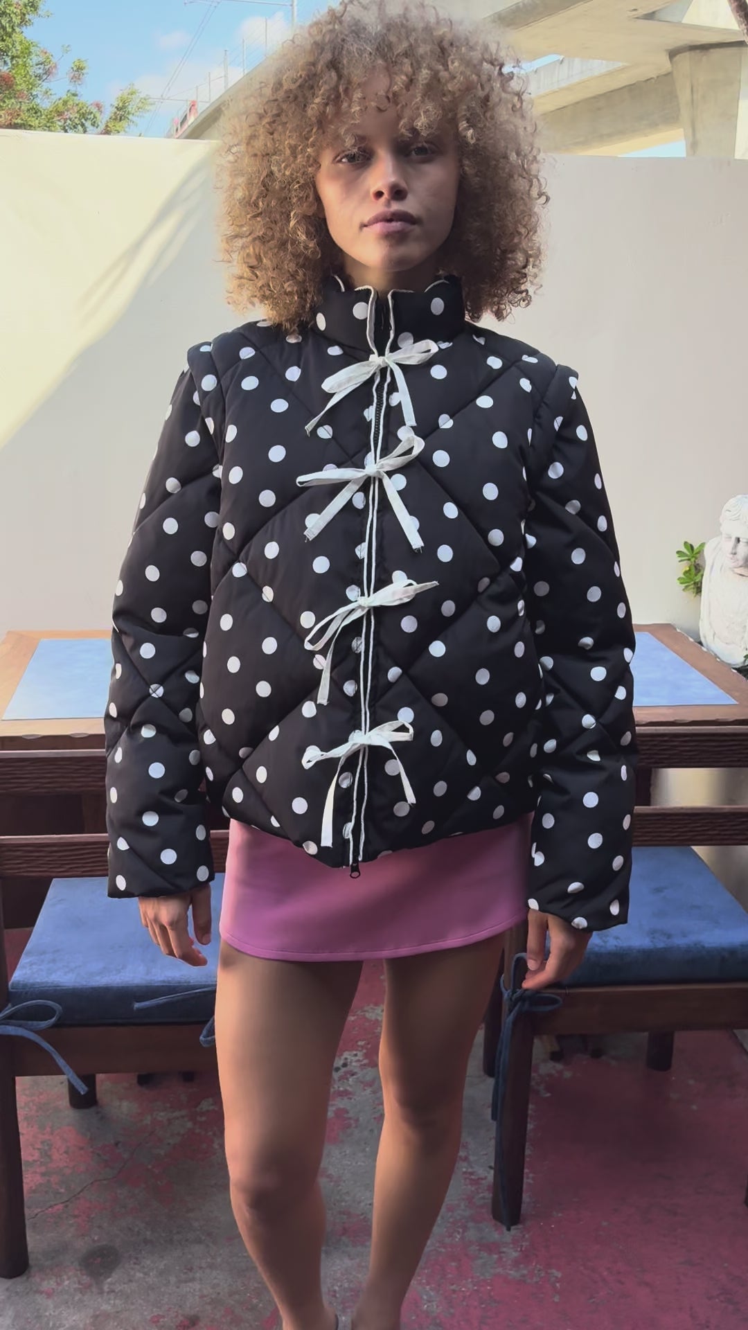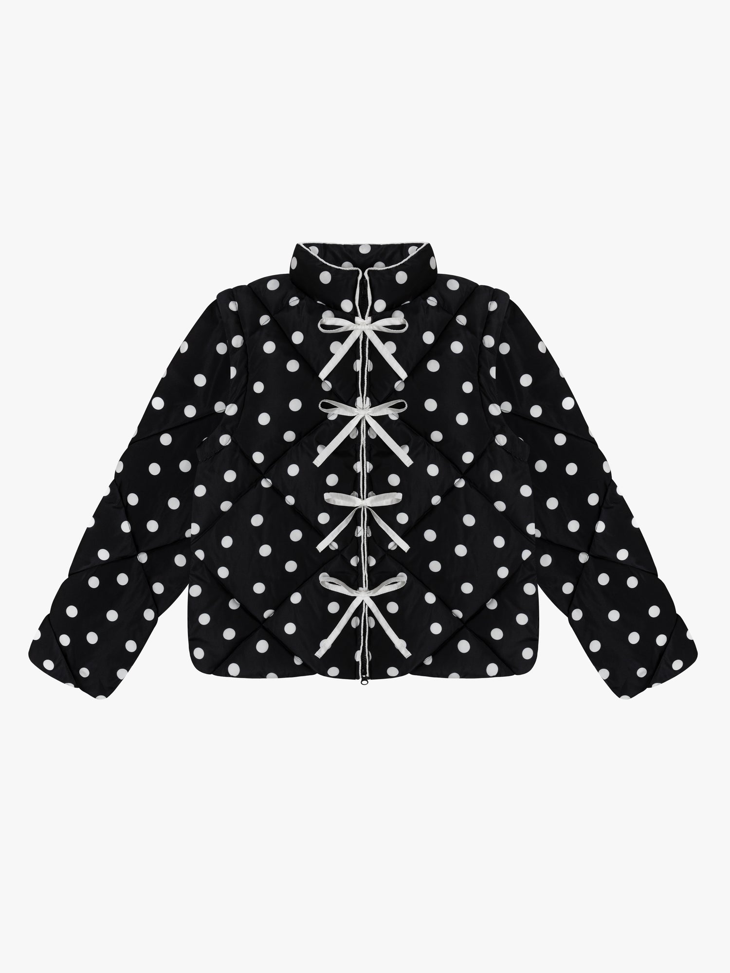 Your favorite winter coat— the Lady Puffer Jacket is a quilted puffer jacket with removable sleeves for a versatile jacket/vest combination. Accented with ties at the zipper. Featured in our signature black dot print.