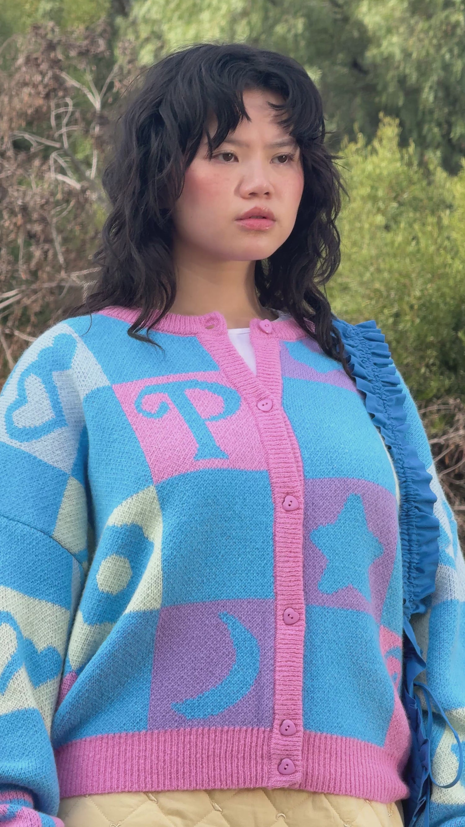 Slightly oversized soft wool blend cardigan in our signature Polly Pocket™ Charms check print from our Polly Pocket™ Says Gah! collab.