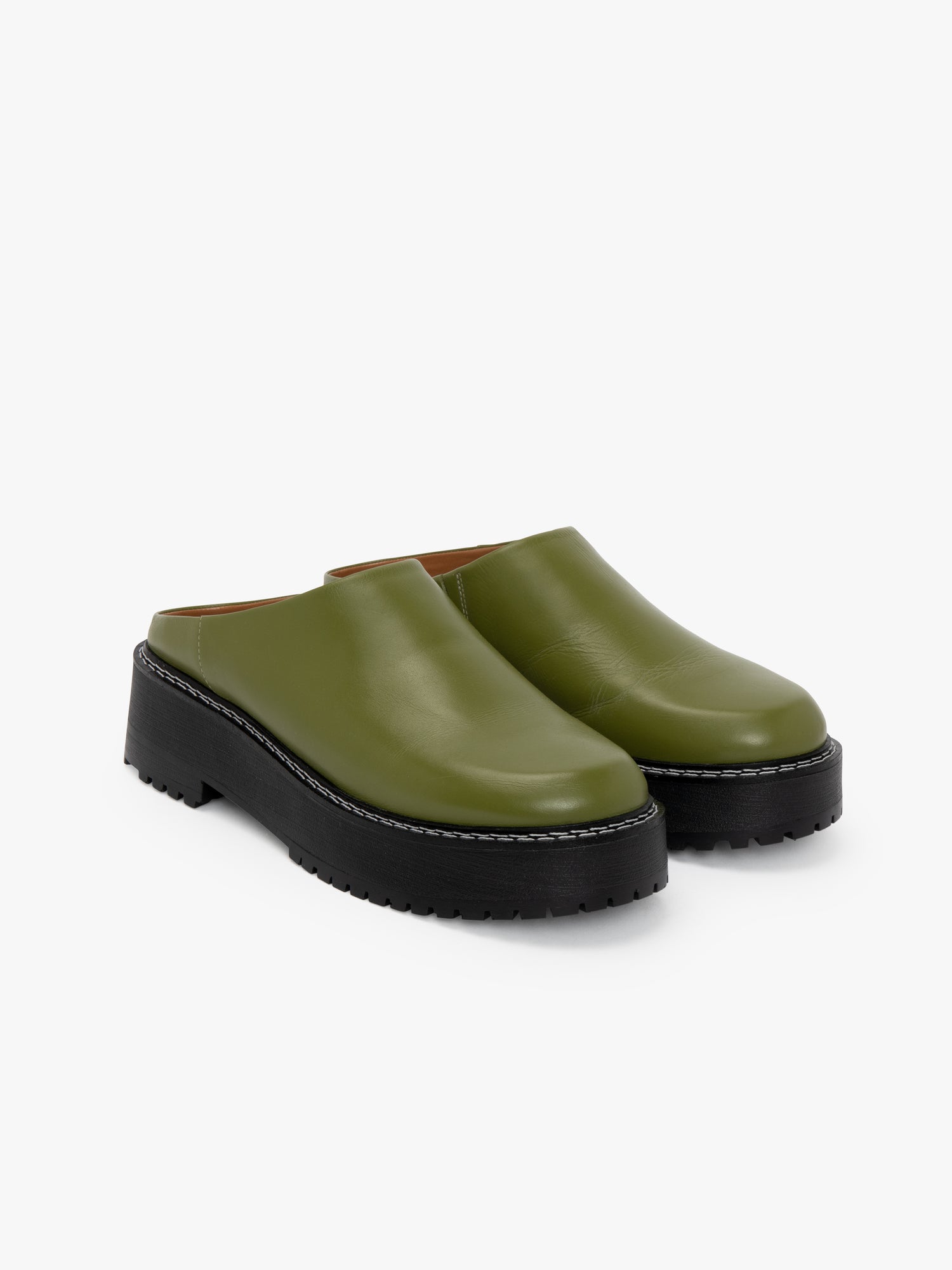 Pamper yourself with this comfy platform mule slide - made from smooth, sumptuous olive green pebble leather and elevated by the pristine white stitching on the bottom. Slip into a pair of socks for a stylish, seasonal look.