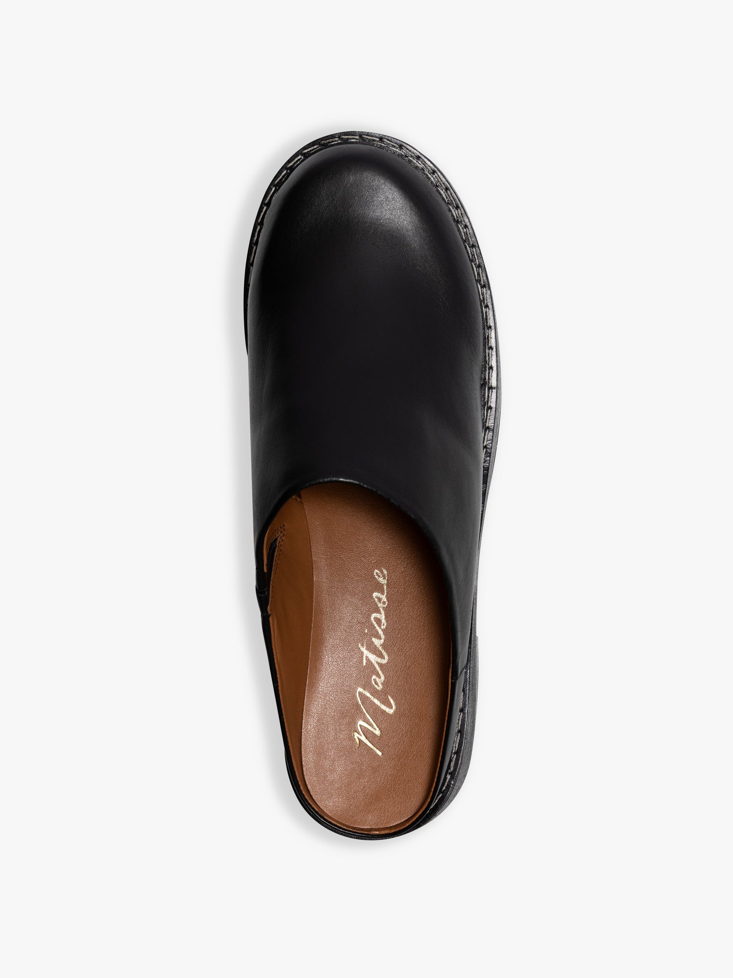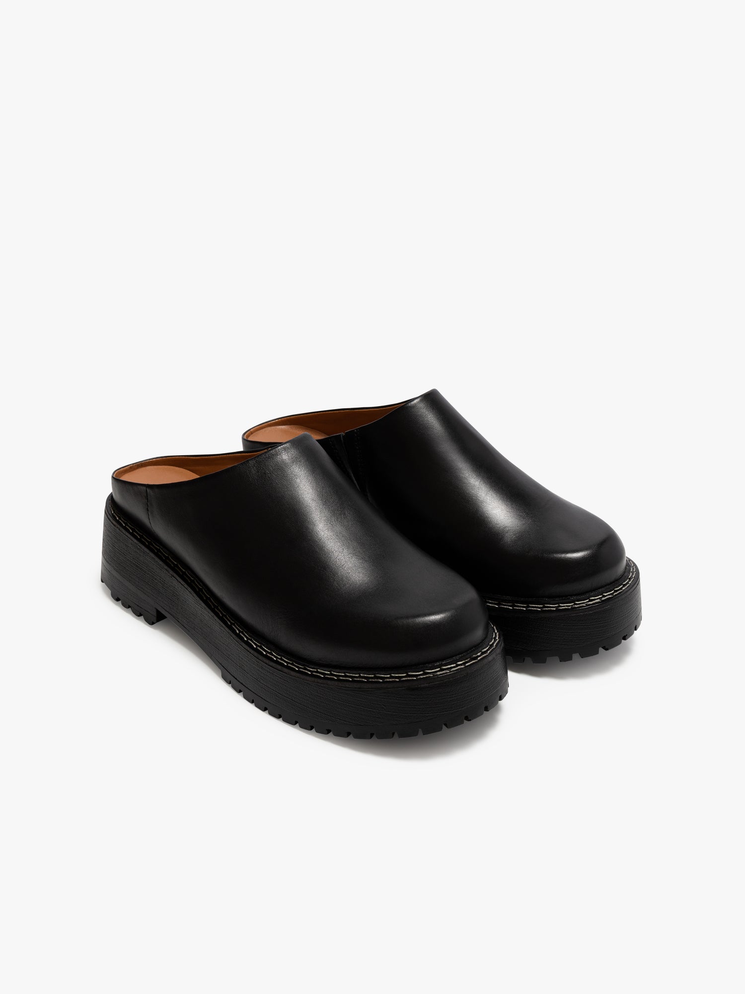 *runs about a 1/2 size small* A super comfy chunky black platform mule slide. Made with a smooth leather upper and lightweight bottom with white contrast stitching. Wear it with socks for cooler weather!