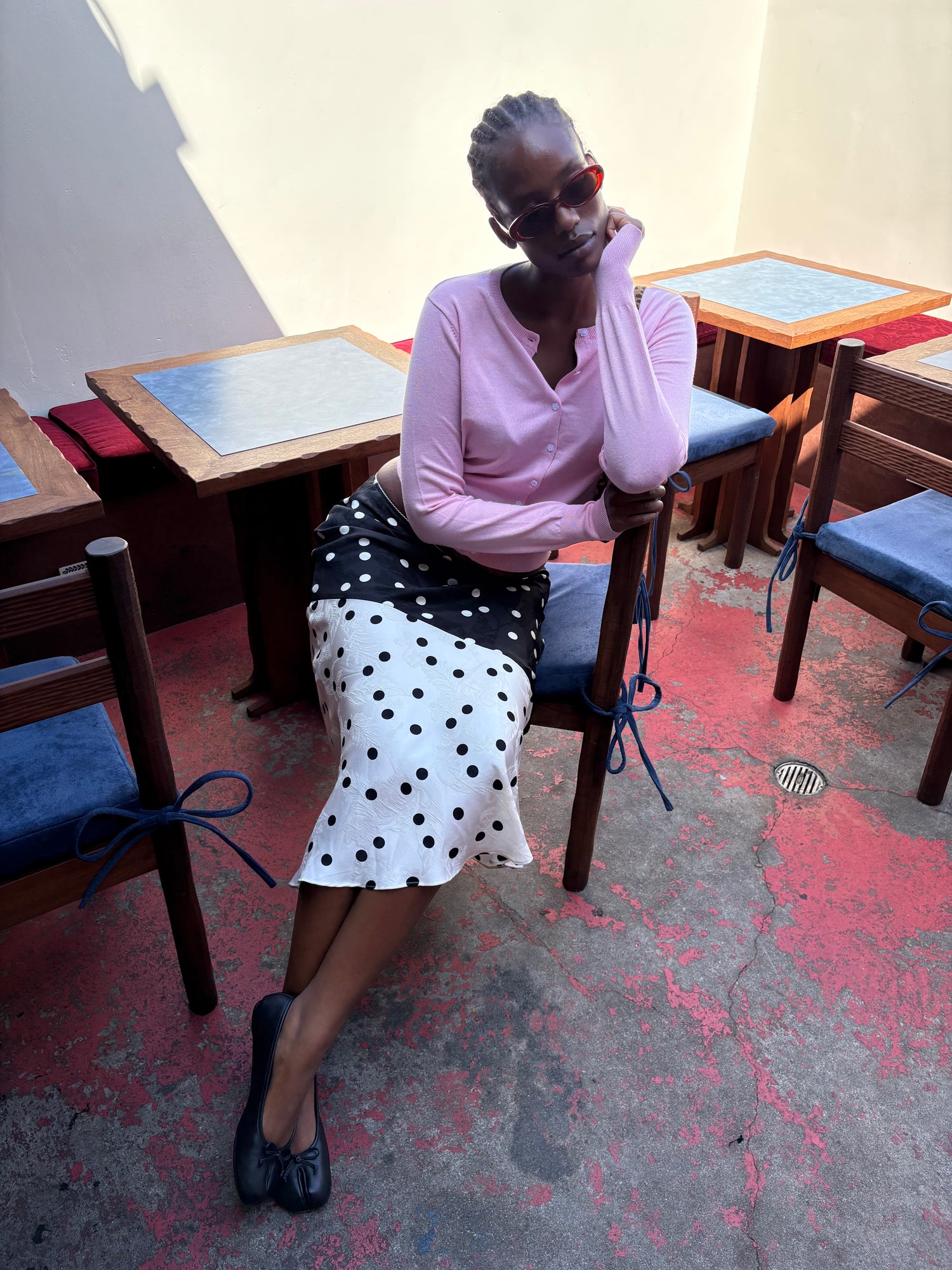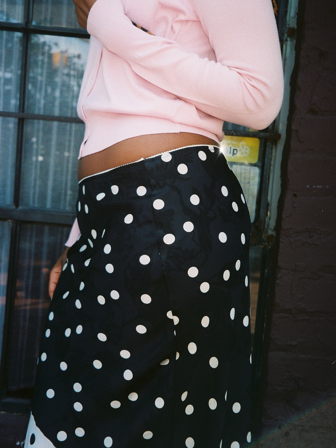 The Lily Skirt is midi skirt featured in our signature black & white dot print. This skirt features a two-tone asymmetrical design that creates a nice shape that falls perfectly on the body. Unlined. Zipper closure at side seam.