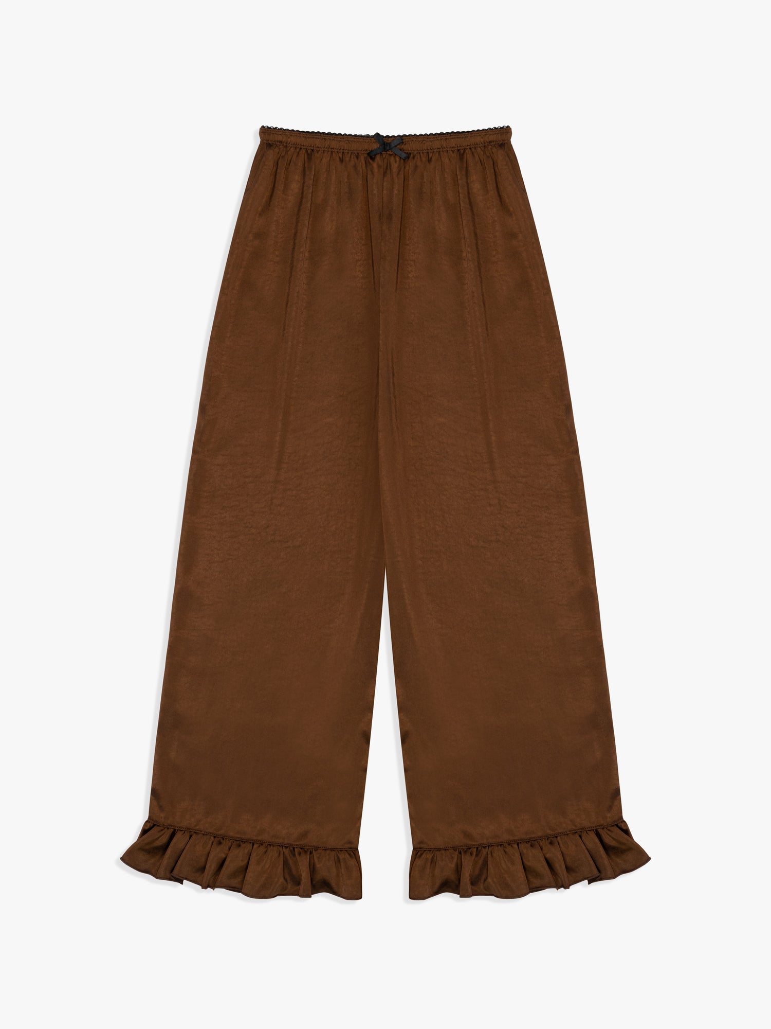 Say Gah to the Liora Ruffle Pant: A satin trouser in a wide leg cut, featuring an elasticized waist, a ruffle hem, and a small bow appliqué.
