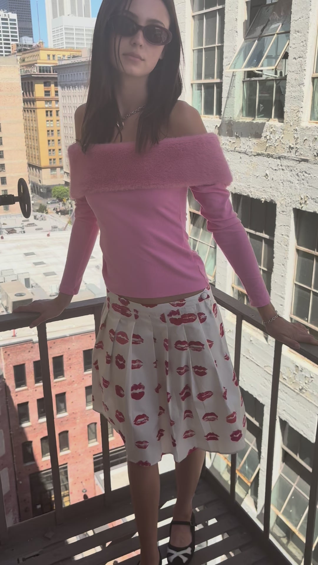 The Lipstick Stains Pleated Skirt from Tyler McGillivary is playful, flirty, and full of movement. Featuring a crisp white base covered in bold red lipstick kiss prints, this skirt brings a cheeky edge to a classic pleated silhouette. Its swingy shape and mid-length cut make it easy to dress up or down!