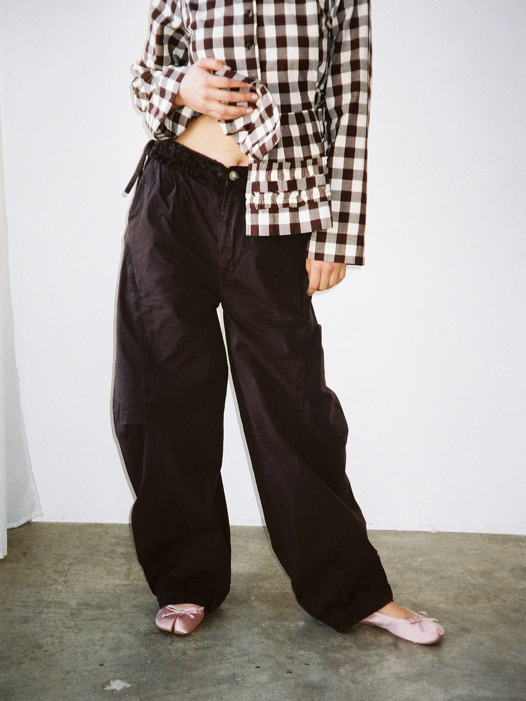 Introducing The Liv Trouser in Coffee Bean from Damson Madder. The full-length, baggy barrel leg pant has a relaxed feel and soft organic cotton fabric. Detailed with a ruched frill at the waistband, twisted seams through the leg, and a zip fly with button closure. Designed for easy, everyday wear, pick your usual size.