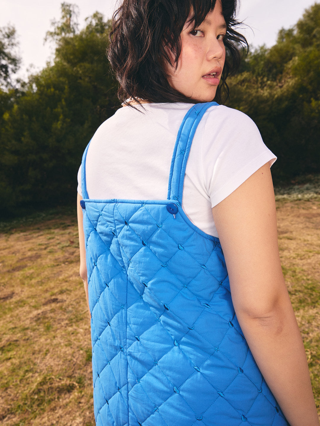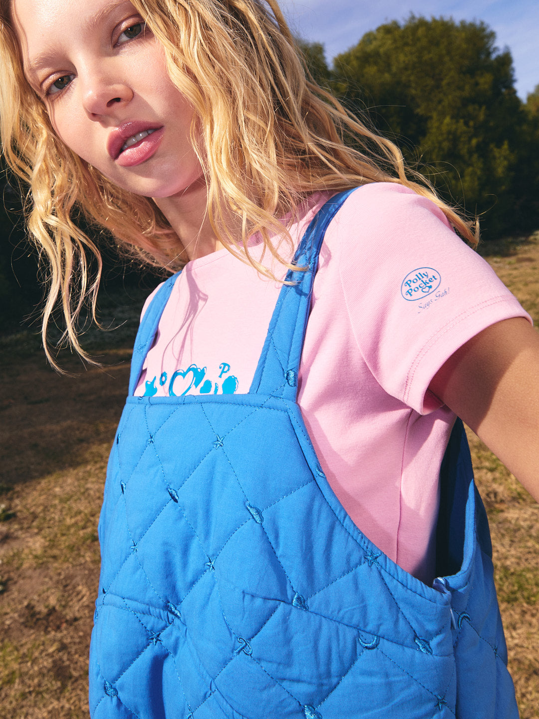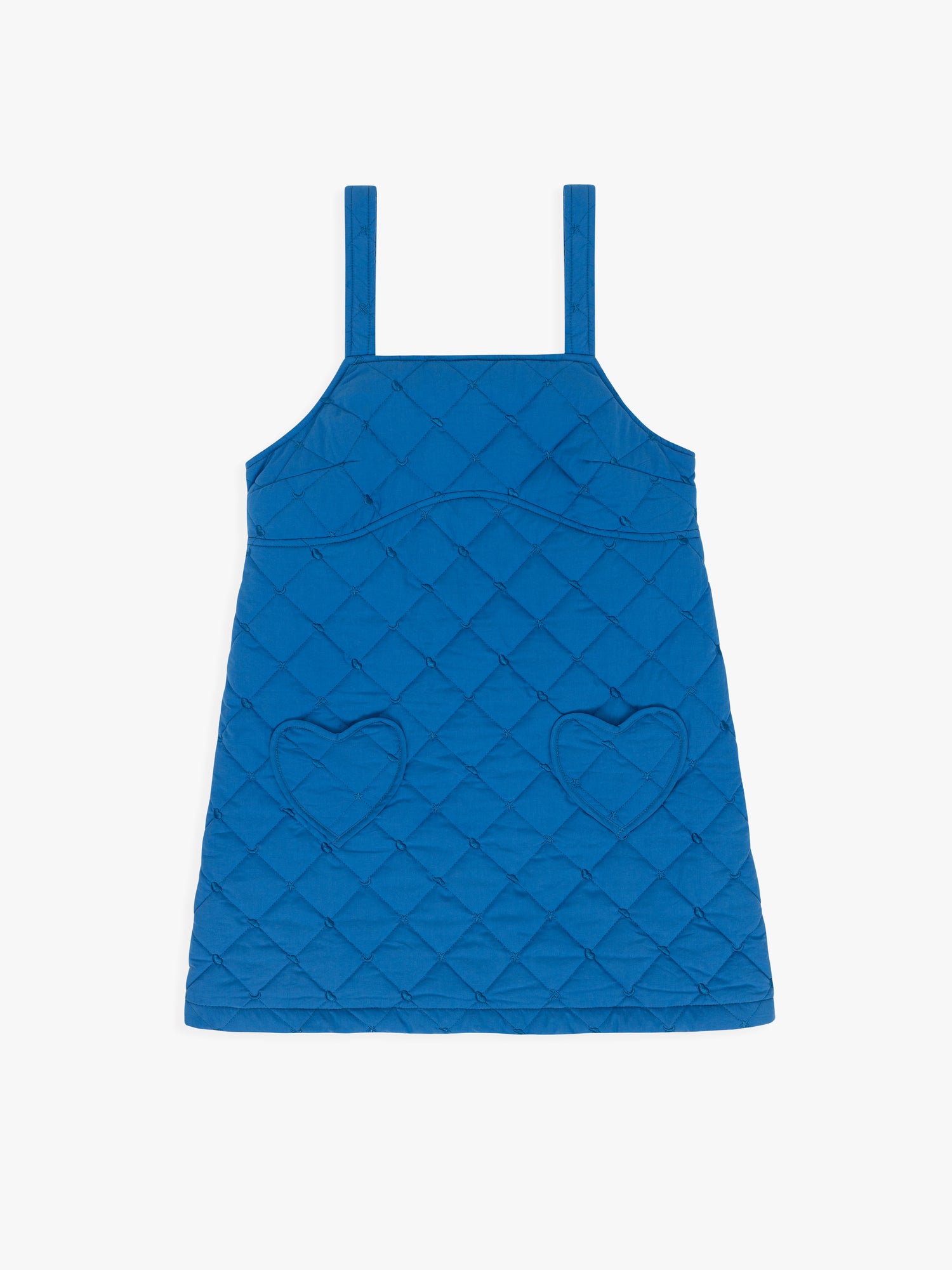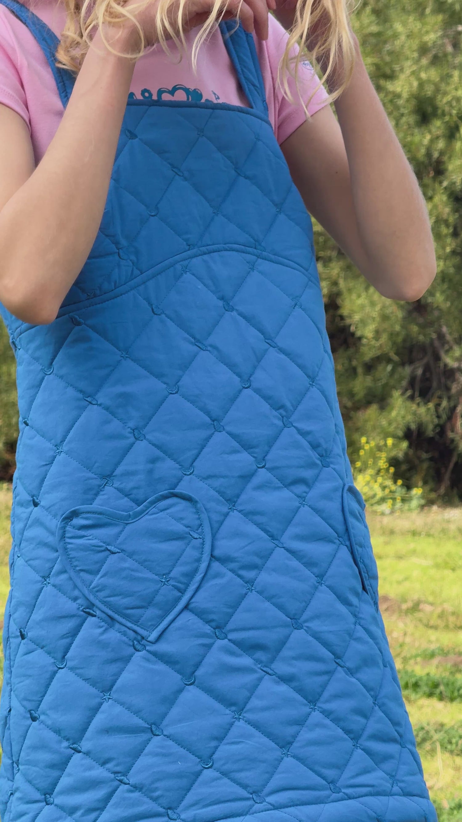 Quilted overall-style dress in our signature Polly Pocket™ Blue featuring functional and decorative heart shaped pockets. Fully Lined