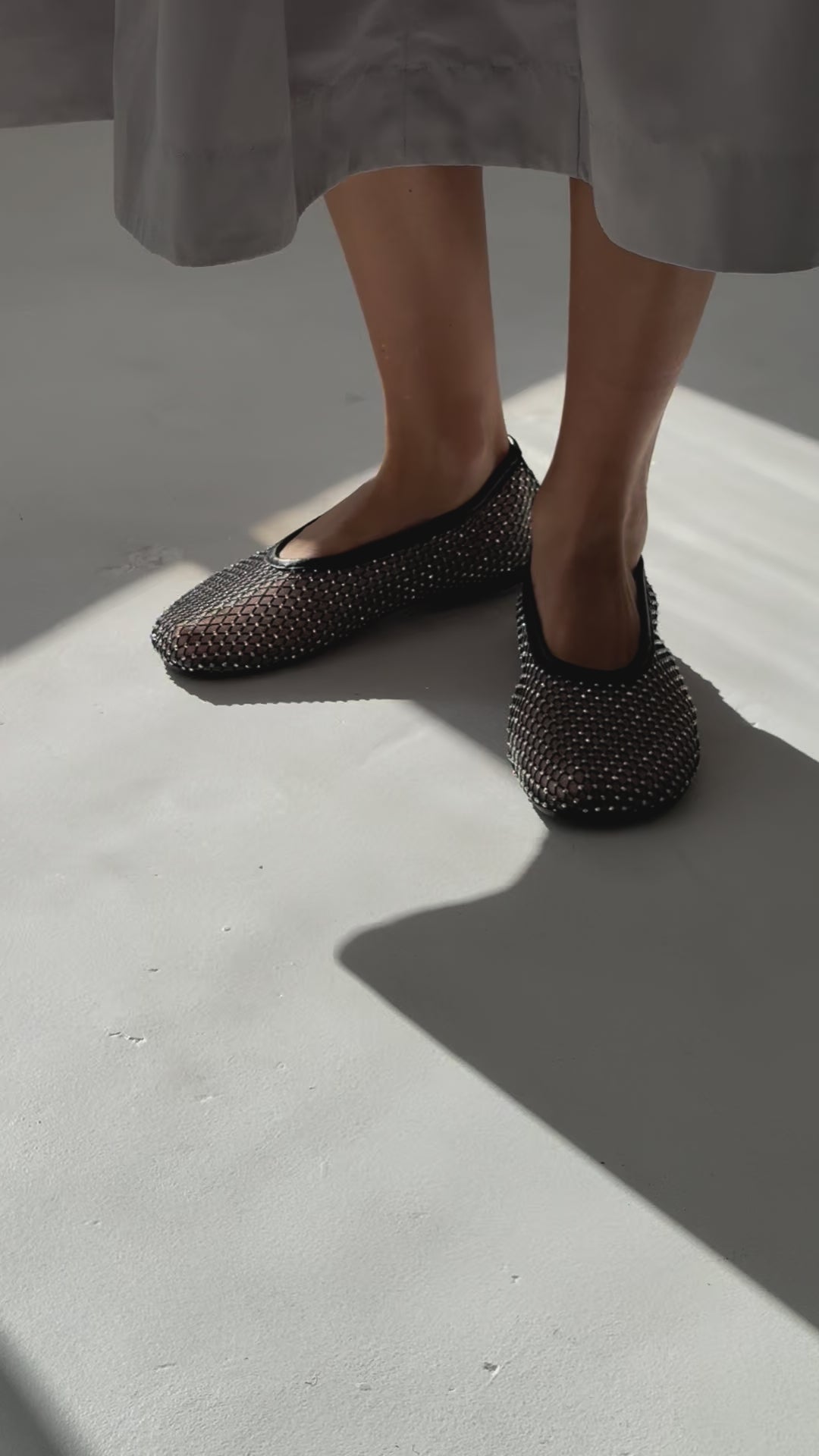 Introducing the Lorain Mesh Ballet Flats from Alohas. With a chic, breathable design and rhinestone embellishments, they add just the right touch of glam to any look. Effortlessly stylish and comfortable, these flats are your new go-to for a little extra shine, day or night.