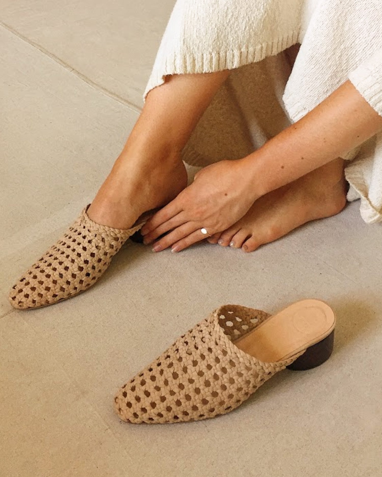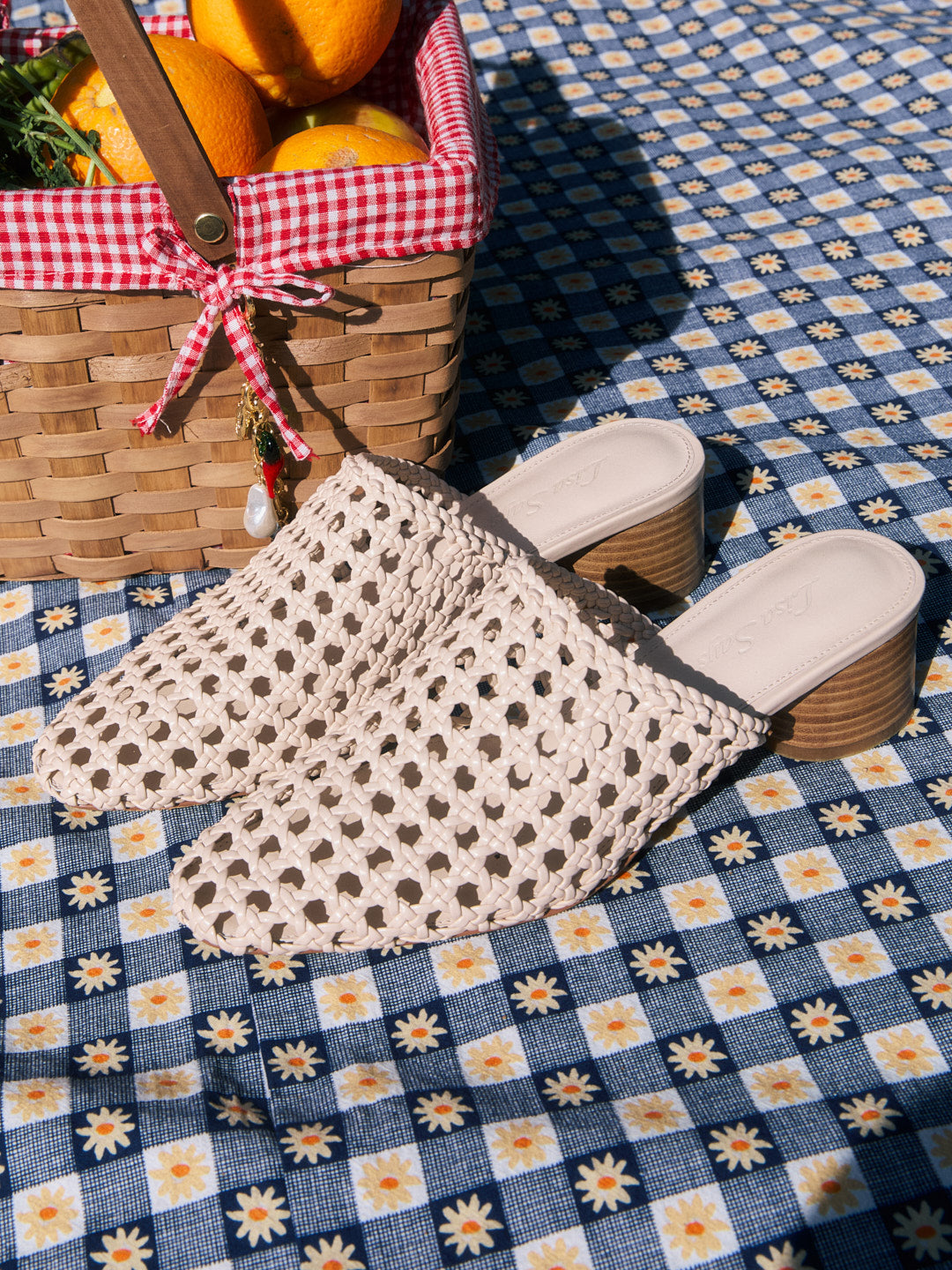 A woven slip-on mule with a breathable lattice design, a chunky stacked heel, featured in a neutral beige tone.