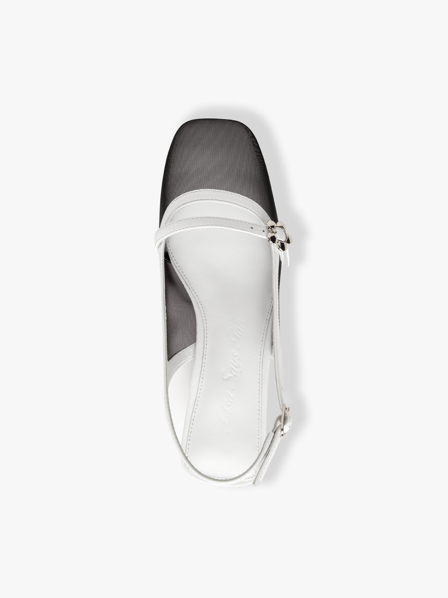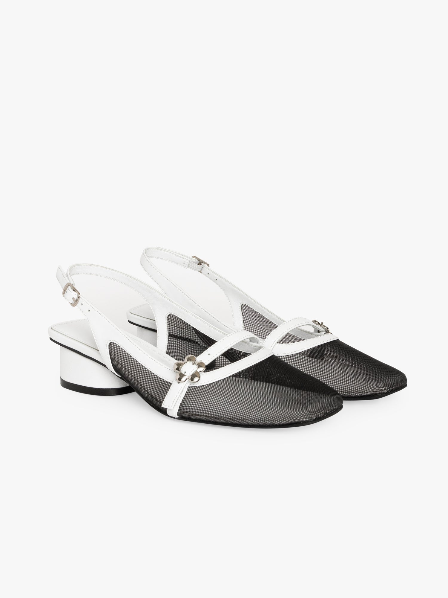 A black and white mesh closed-toe slingback heel with a mesh square toe box and low heel, featuring an adjustable ankle strap and silver flower detail across the top of the foot.