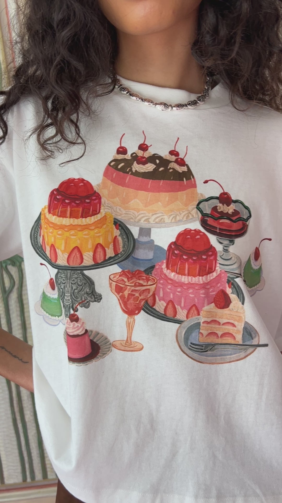 Classic unisex white tee with a slightly cropped boxy fit, drop shoulder, and a thick rib collar in a lightweight cotton jersey with a fun dessert graphic.