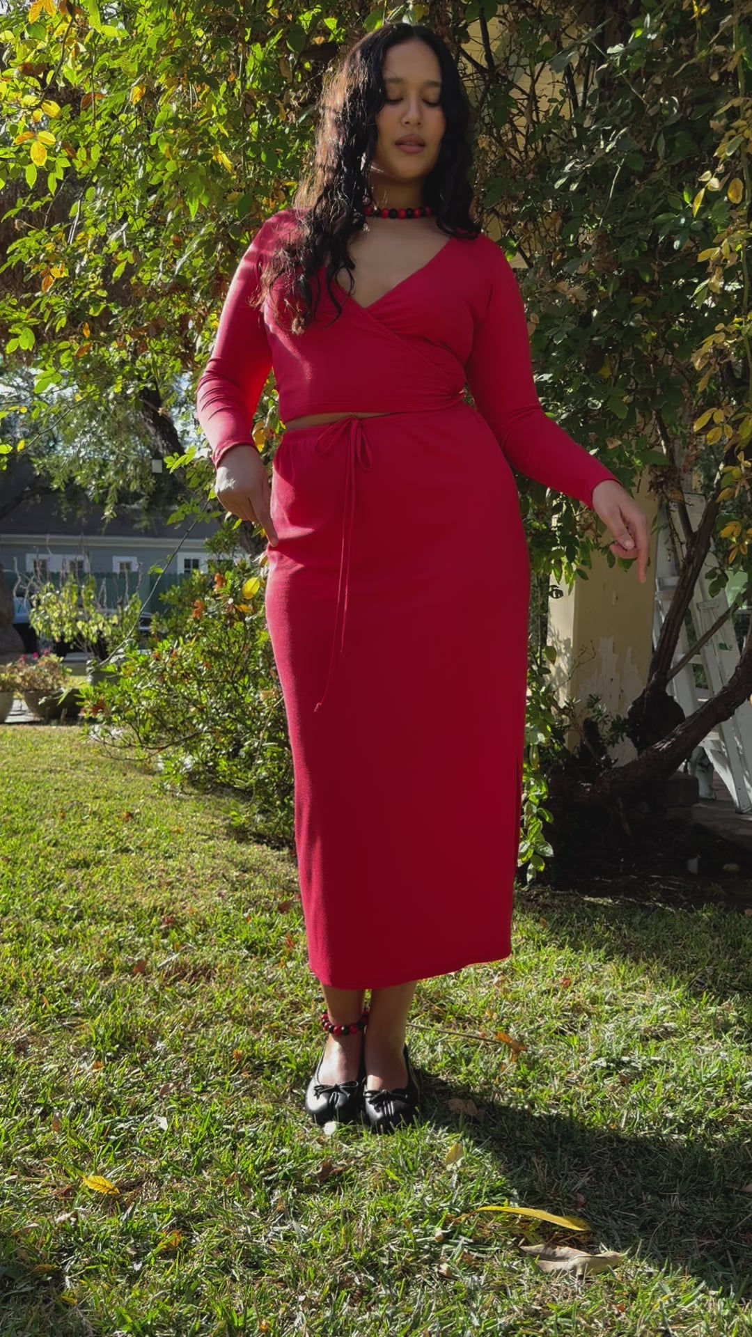 Red cropped-wrap top with stretch for a comfortable and versatile fit. This top fits loose, so we recommend sizing up for a more fitted silhouette.