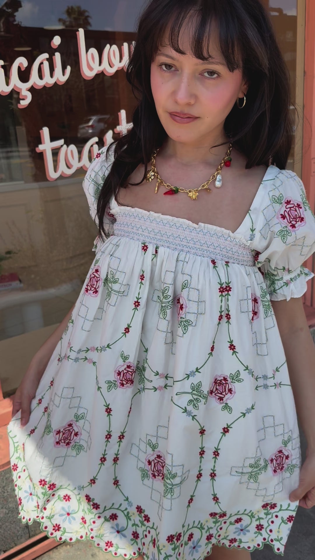 Crafted with an all over rose embroidery design and puff sleeves, the Lulu Mini Dress from Damson Madder is flirty and fun.