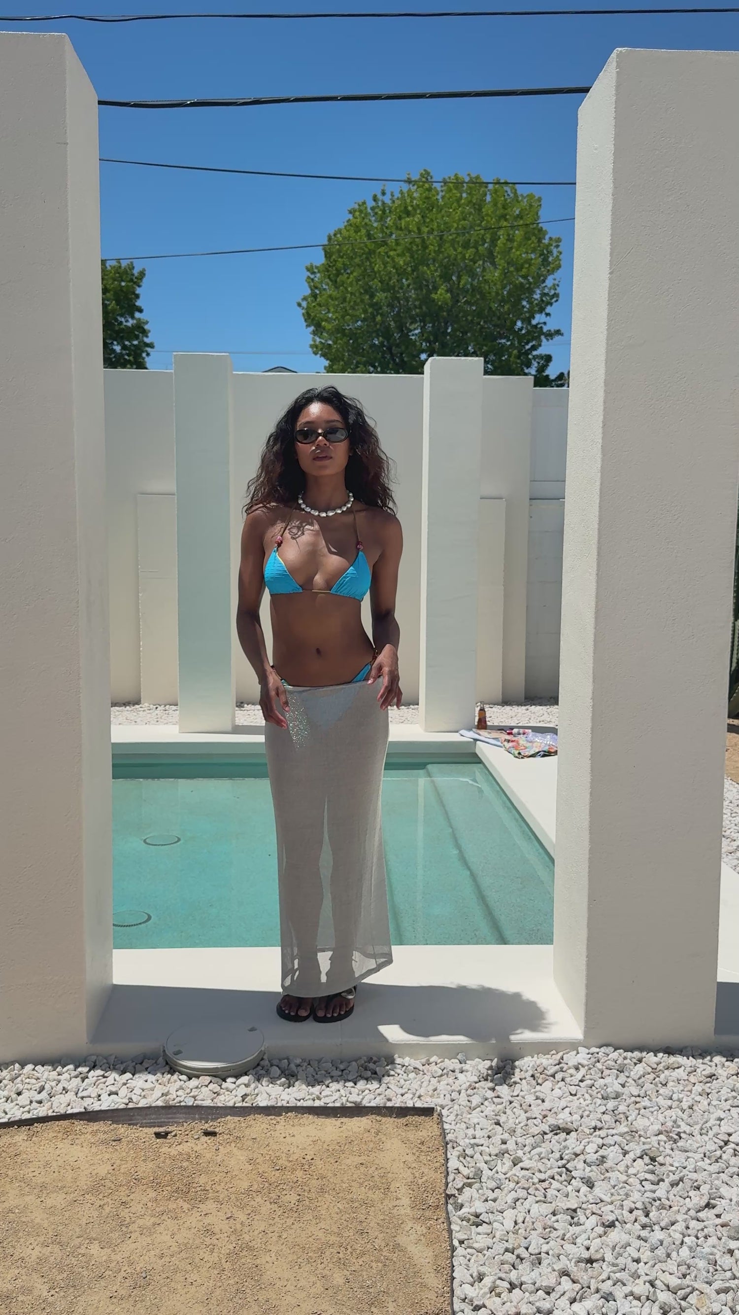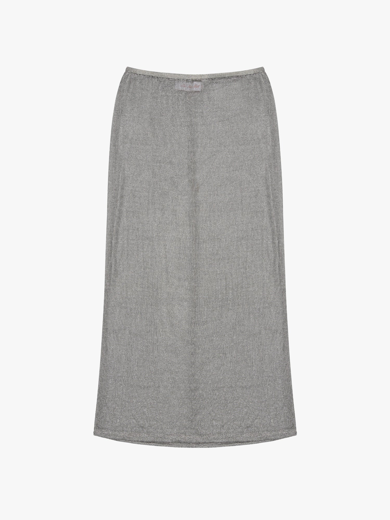 Sheer maxi skirt featured in a super soft metallic fabric with a side slit.