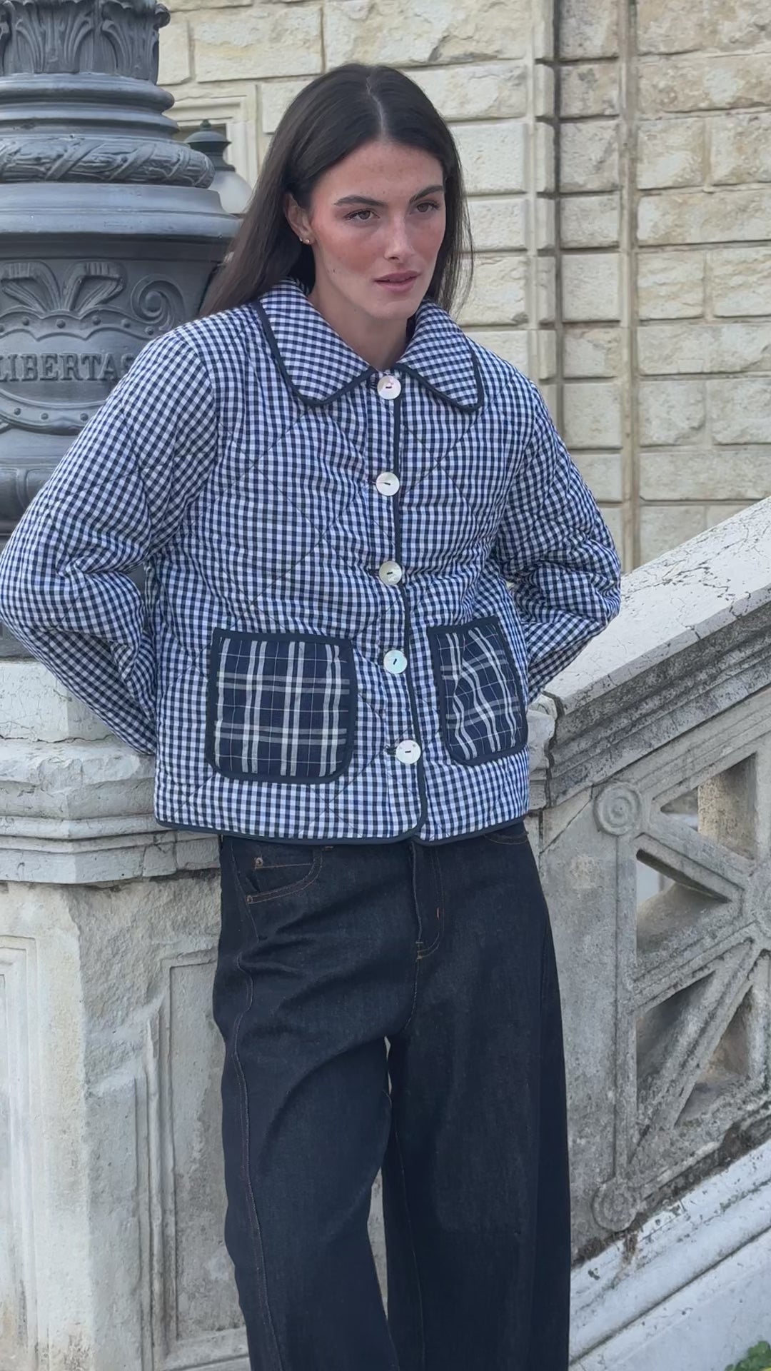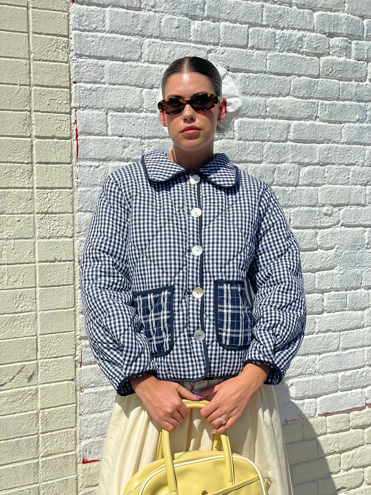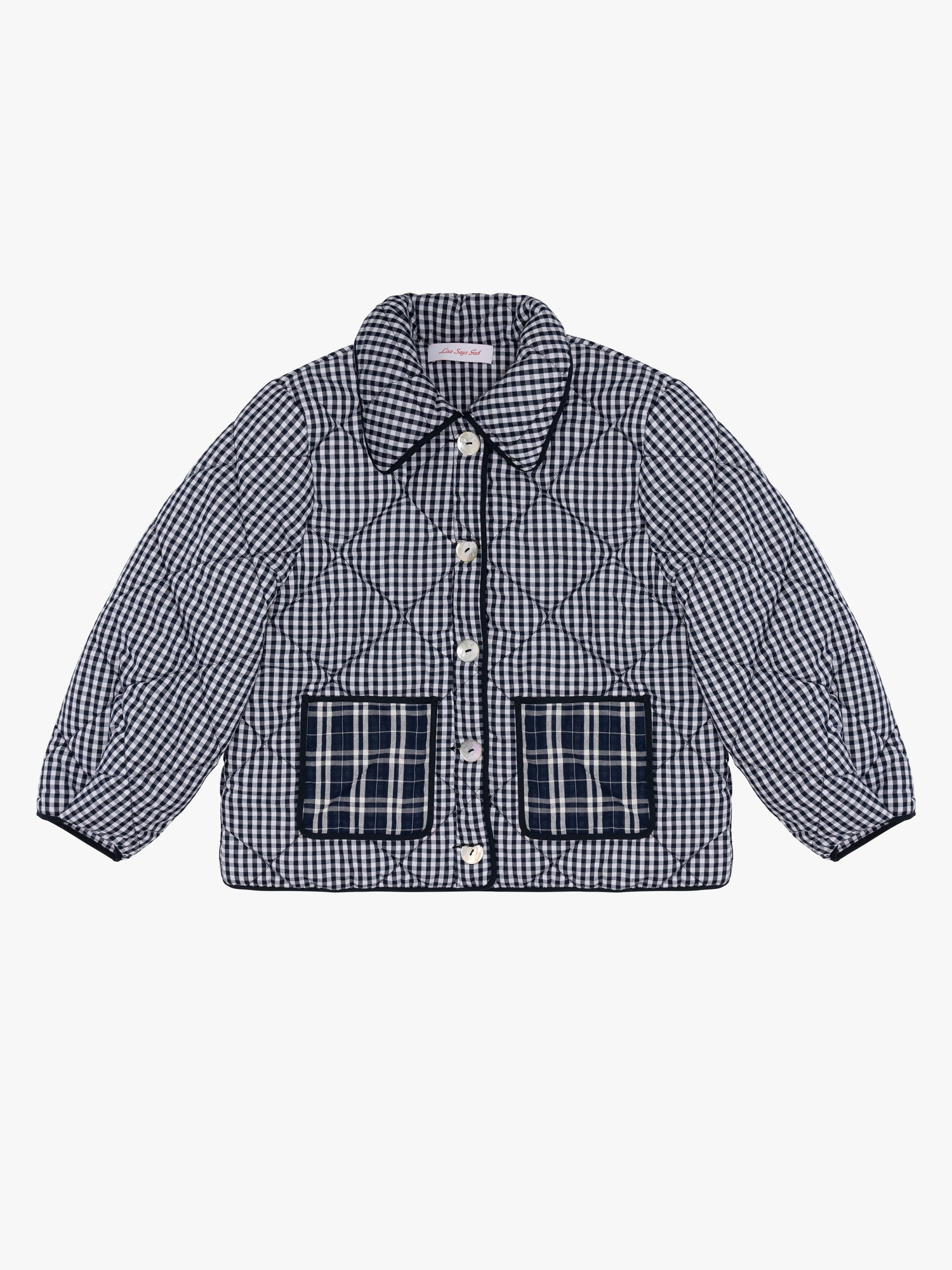 The Lyra Quilted Jacket combines classic prints with a modern silhouette. Designed with alternating our Midnight Check and Plaid prints, it features contrast plaid pockets, navy trim, and a quilted finish for extra warmth. Pleated sleeves taper into a subtle balloon shape, adding a unique twist to this button-down layer.