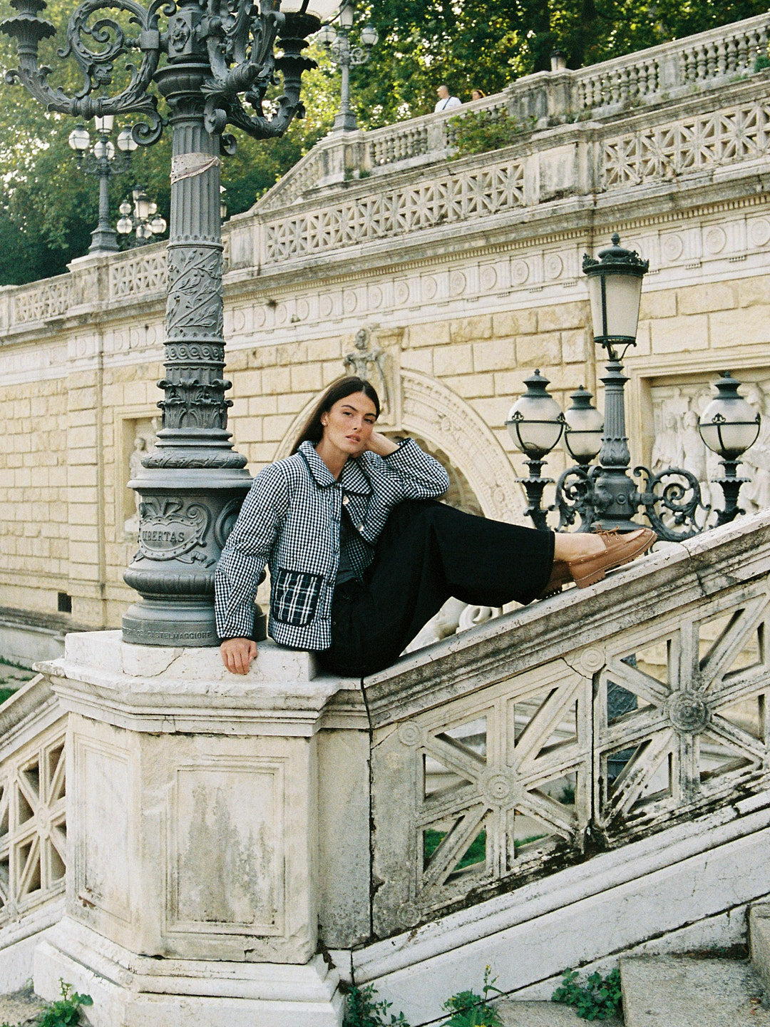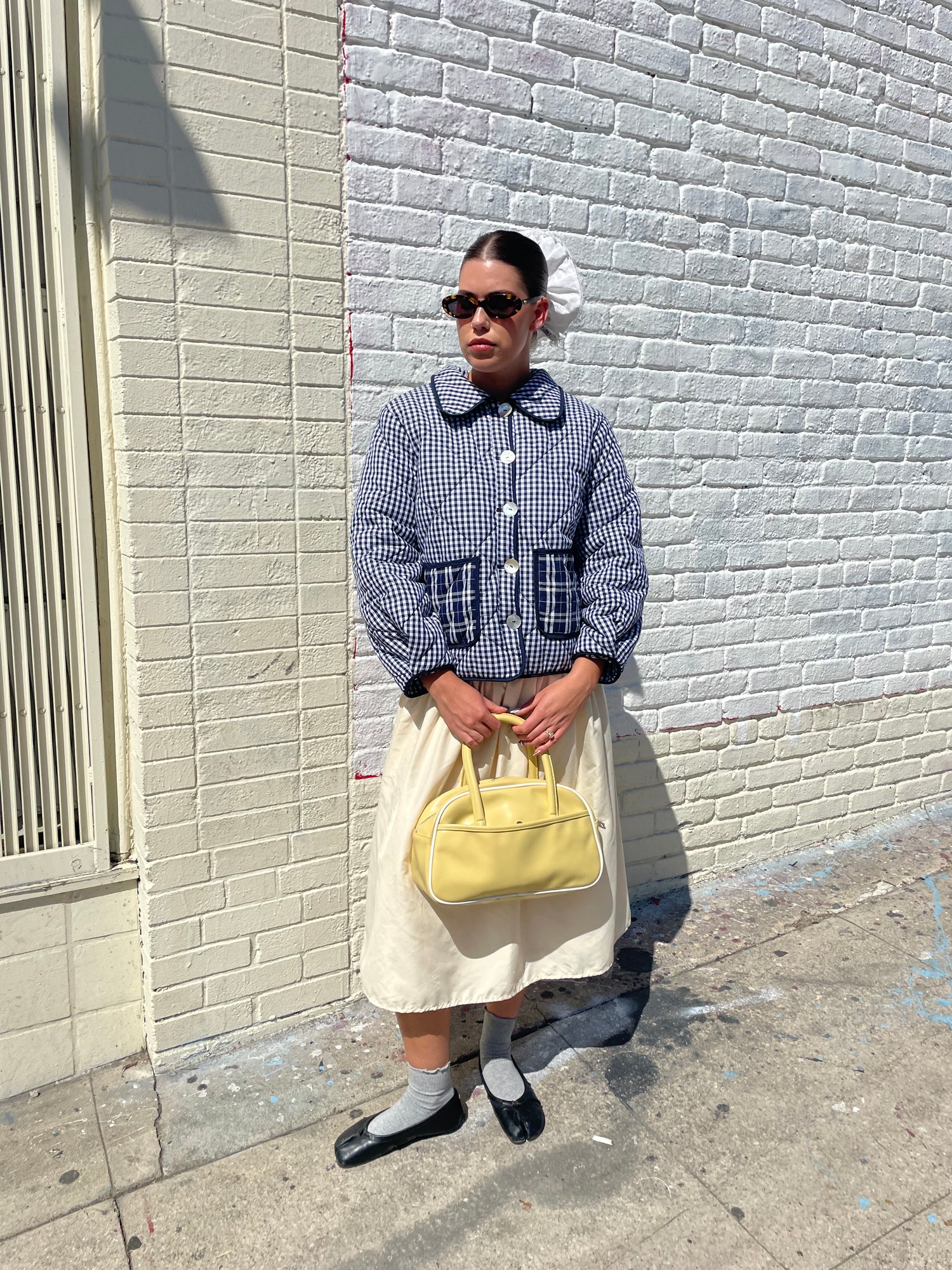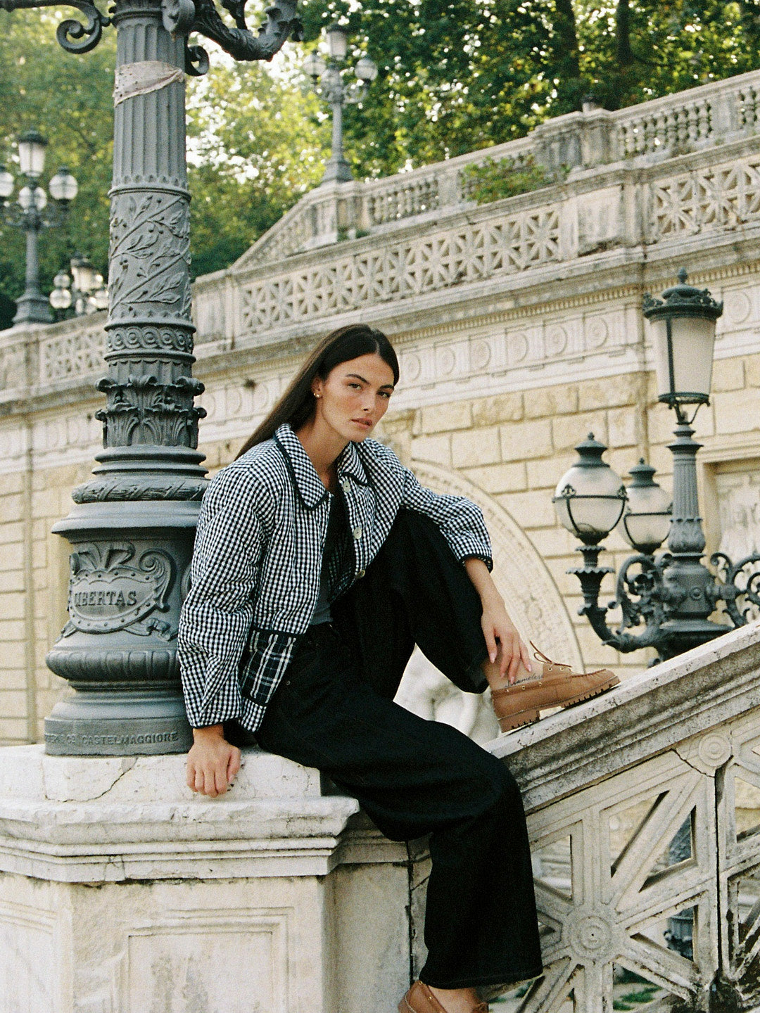 The Lyra Quilted Jacket combines classic prints with a modern silhouette. Designed with alternating our Midnight Check and Plaid prints, it features contrast plaid pockets, navy trim, and a quilted finish for extra warmth. Pleated sleeves taper into a subtle balloon shape, adding a unique twist to this button-down layer.