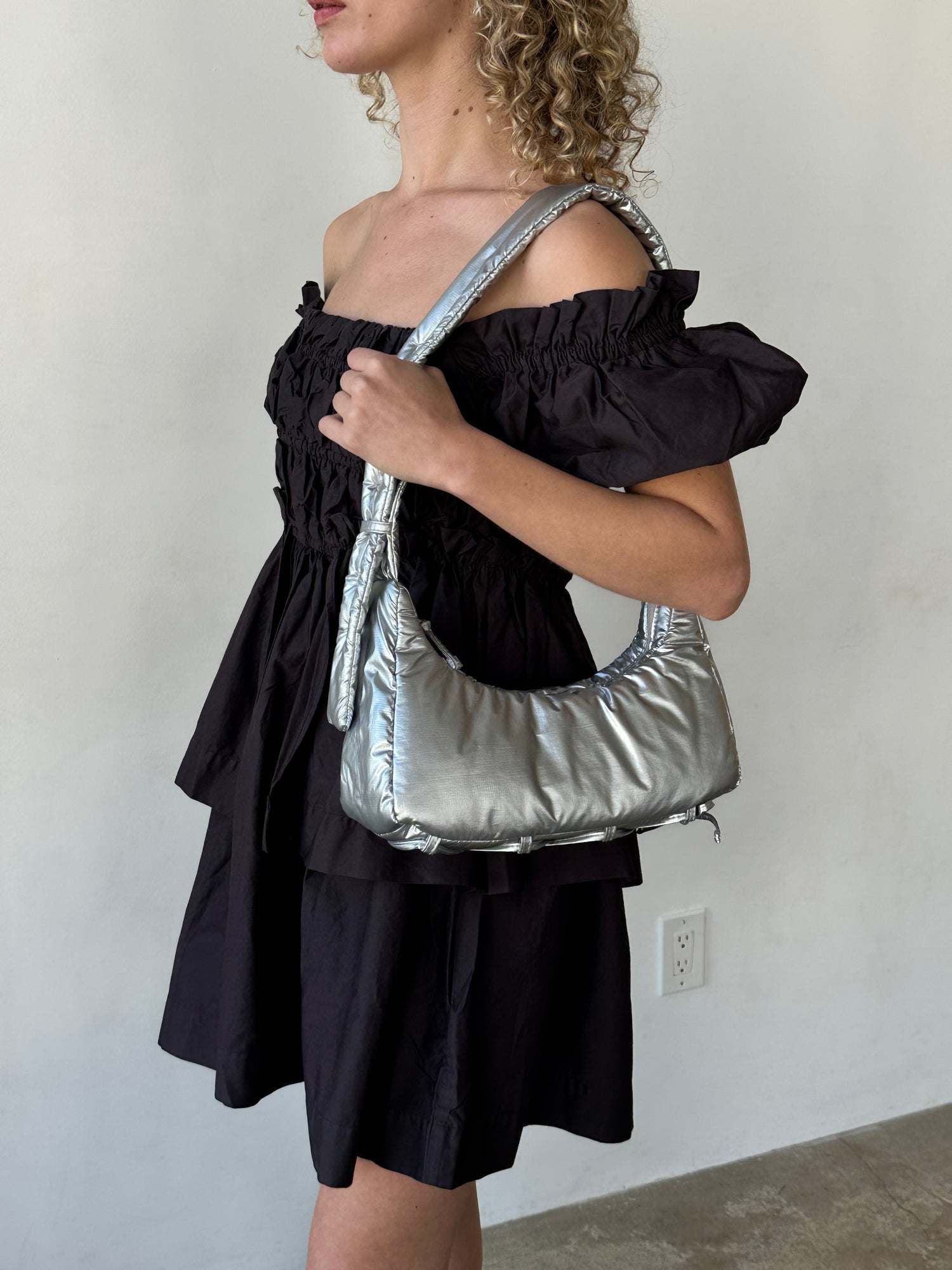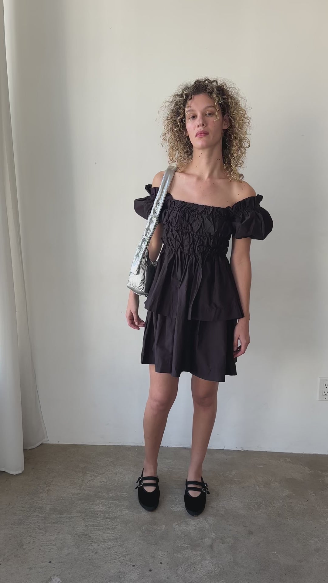 Introducing The Lyza Dress from Damson Madder. The Lyza features a square neckline, puff sleeves, and an elasticated ruched body for an easy, flattering fit. Crafted from 100% organic cotton in classic black, it's the perfect throw on mini for day-to-night wear.