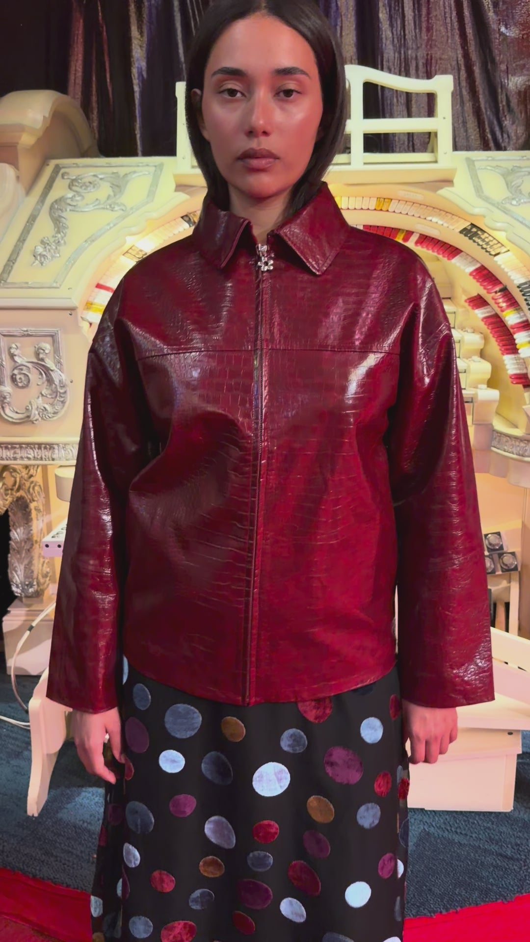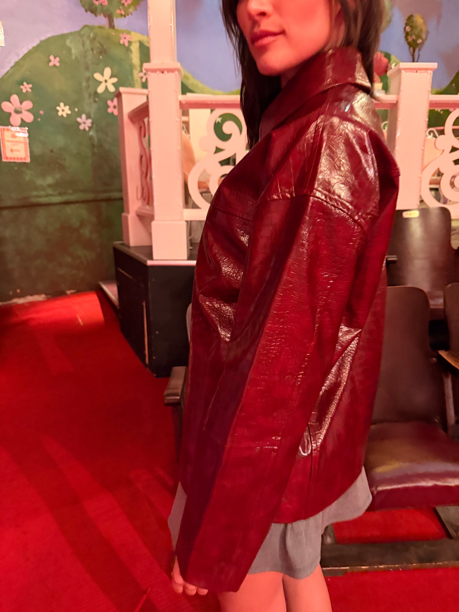 Your favorite oversized jacket, The Macey but in a fun patent Vino Croc. This vintage style red faux patent leather jacket is designed with a boxy fit and silver zipper. Perfect for making a stylish statement! Light enough for all-year wear. Runs large with an oversized fit.