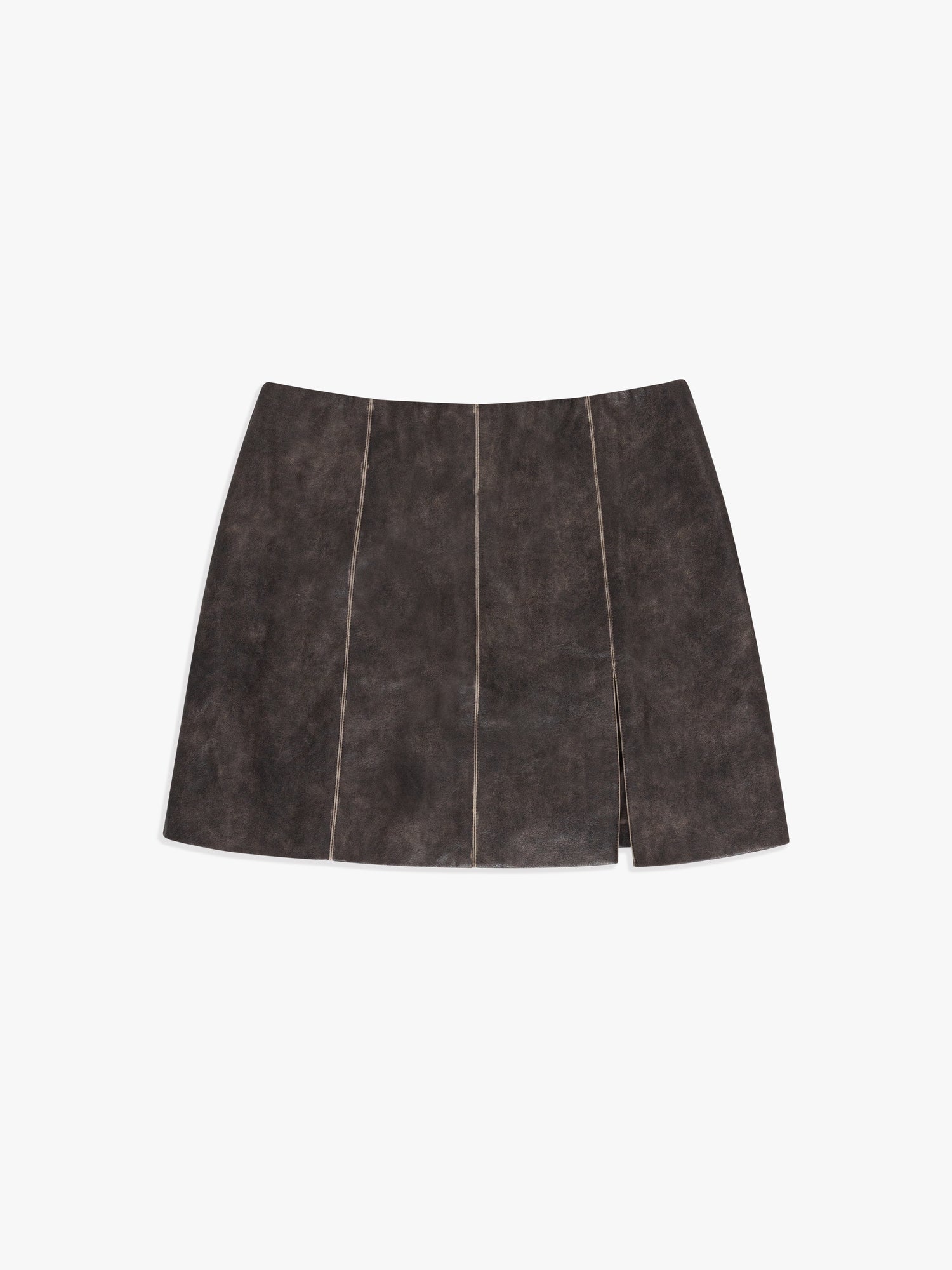 The Macey Skirt is a washed black mini faux leather skirt with a small slit on the left leg, lined and made with a zipper closure at back.