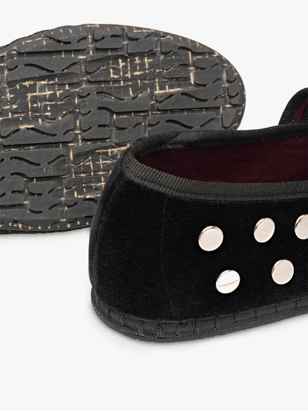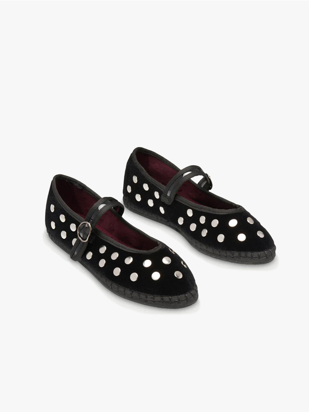 Introducing the Mae flat from Spanish label, Flabelus: This velvet ballerina flat features a v-opening in black with black piping and silver studs. Laced with a patent leather strap and buckle closure. The outside of the shoe is 100% cotton velvet, and the inside of the shoe is 100% organic cotton with anti-bacterial treatment. The sole is made of rubber produced from recycled bicycle tires.