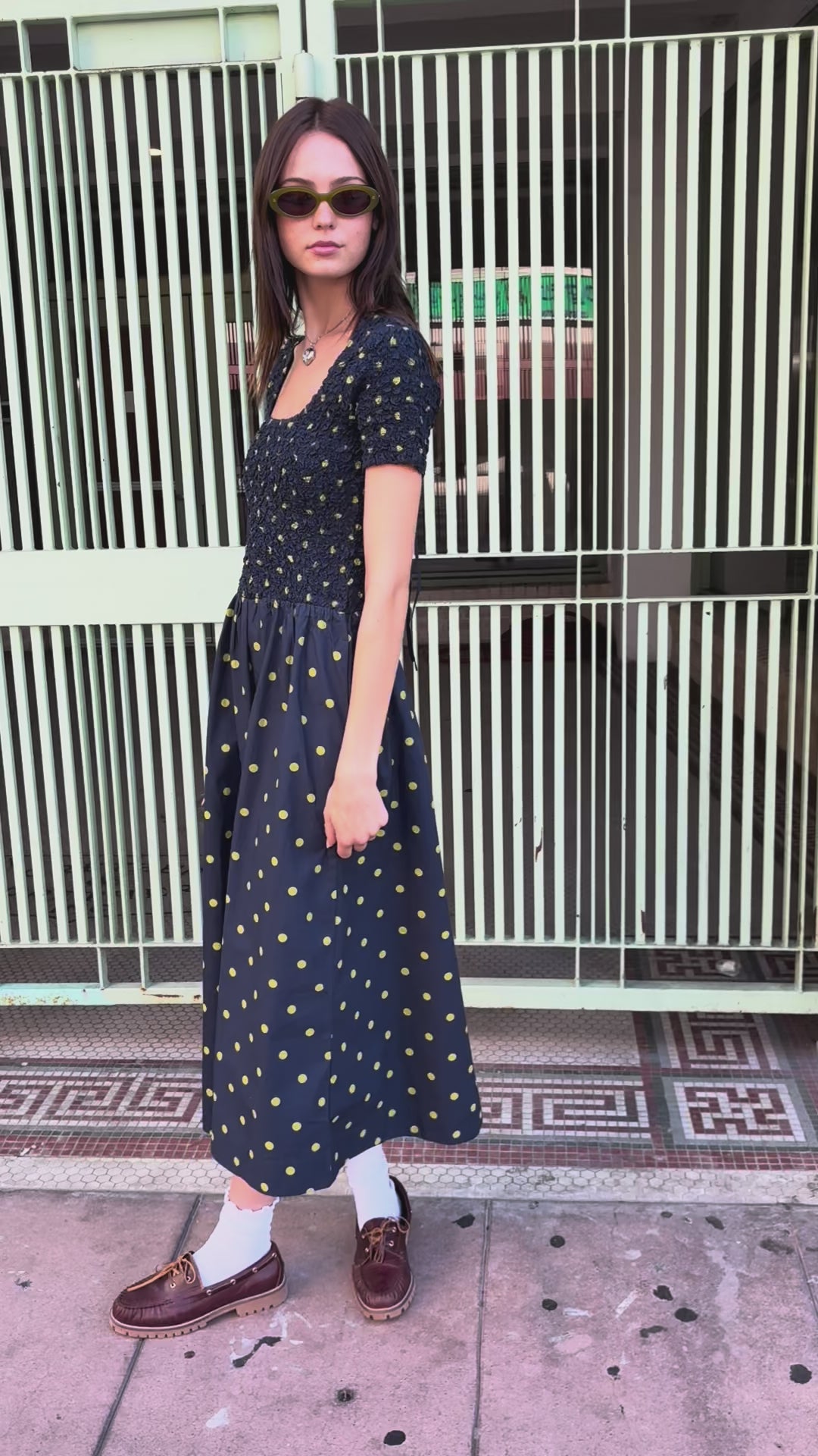 Crafted from 100% organic cotton, the Malinda Super Smocked Midi Dress in navy olive spot is adorned with an all over spot print. Designed with a square neck and hand smocked bodice and sleeves for a flattering fit. The Malinda will effortlessly carry you from day to night.