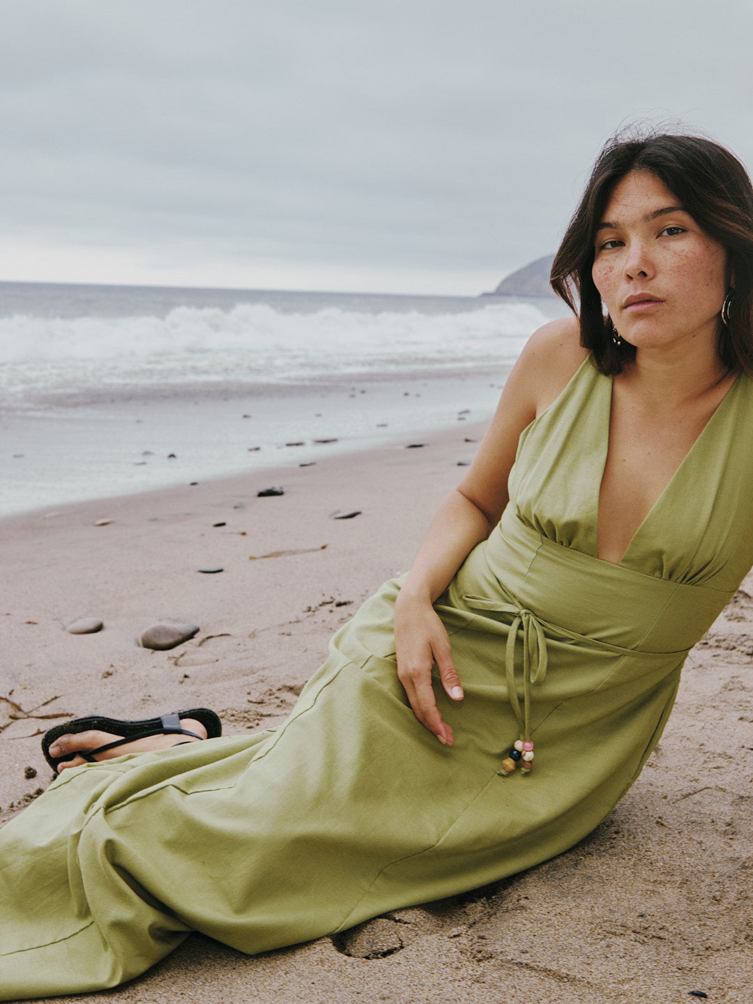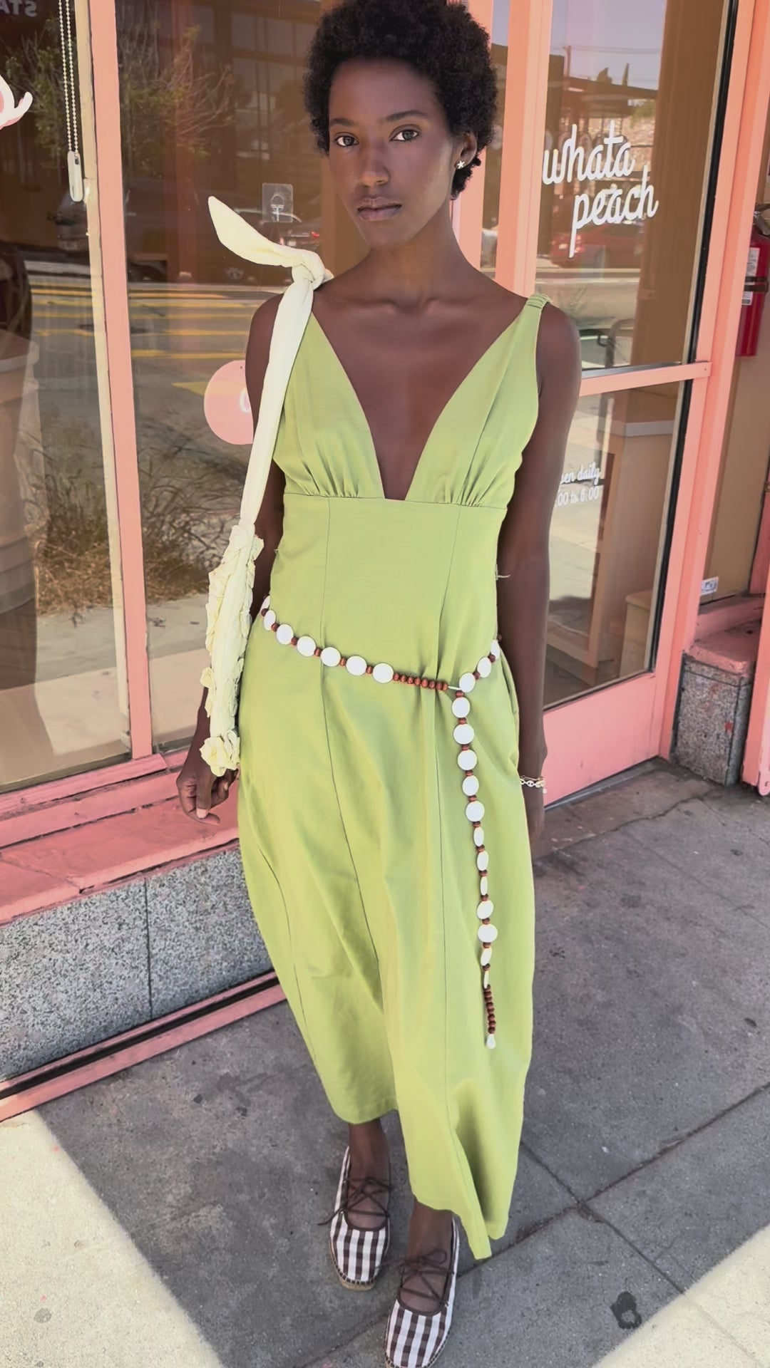 Linen blend midi dress with a plunge-neckline and slinky silhouette. This dress has a detachable belt with wooden bead details. This dress fits one size larger, size down accordingly.