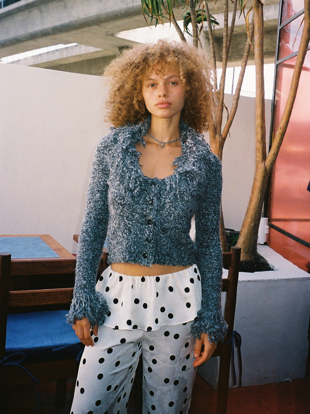The Marla Fringe Cardigan brings texture and personality to a cozy classic. Made from a soft boucle knit, this cropped cardigan is finished with playful fringe details along the collar and cuffs. Button-front closure makes it easy to wear open or closed—perfect for adding a statement touch to your everyday layers.