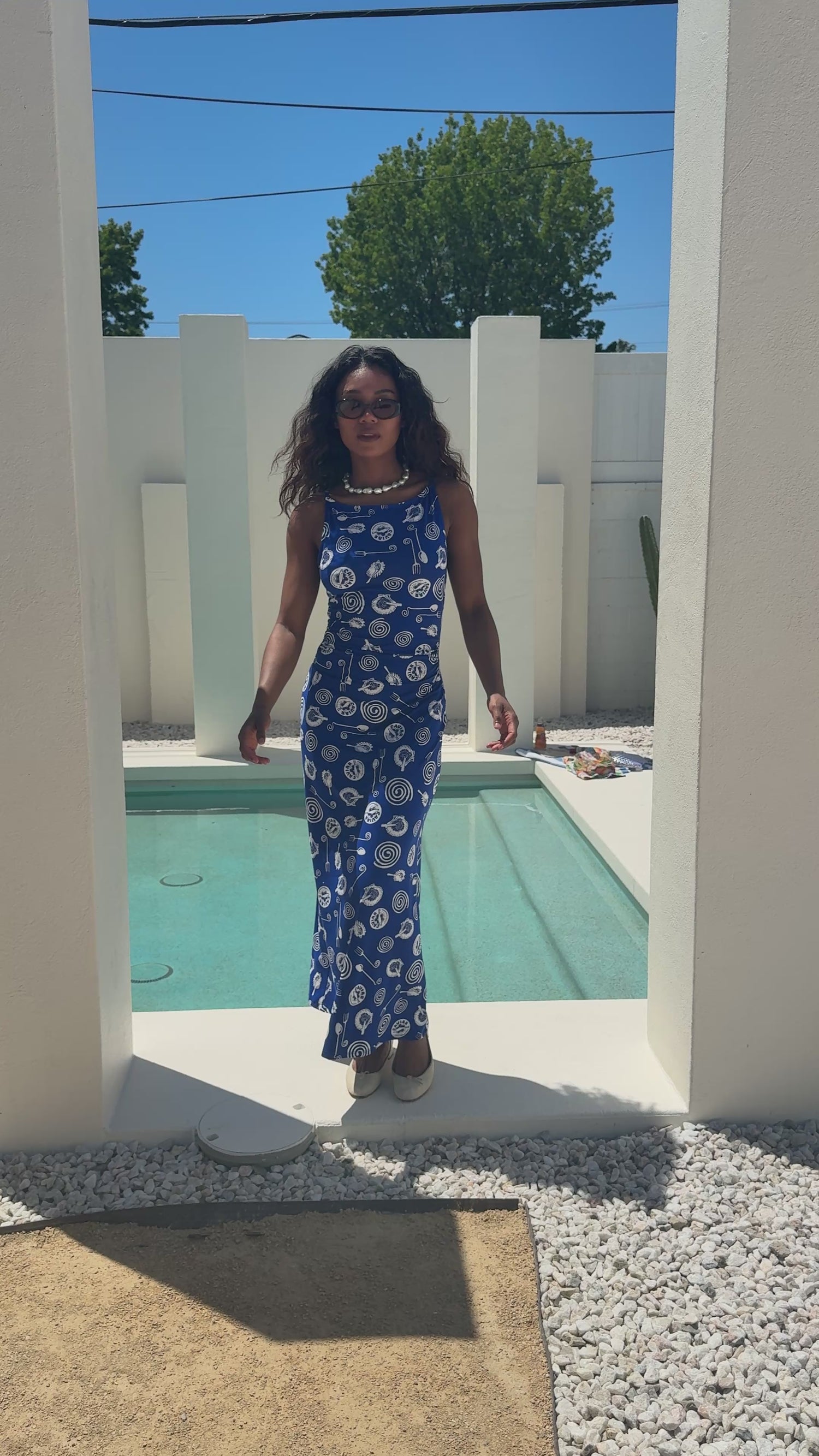 The Maya dress is a form fitting dress with an open, low back featuring a tie at the top of the back and a zip closer at back. Featured in our signature Caviar Dreams Blue print.