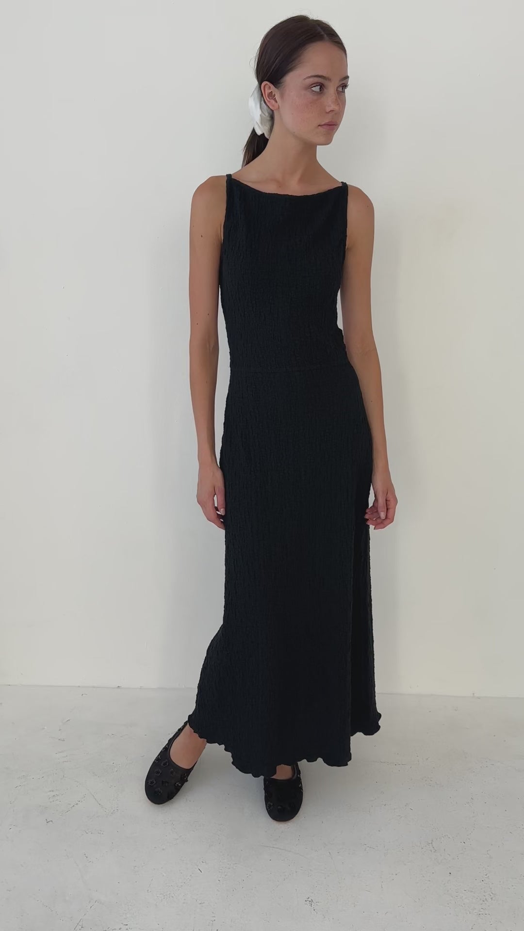 The Maya dress is a form fitting dress with an open, low back featuring a tie at the top of the back with wooden bead details and a zip closure at back.