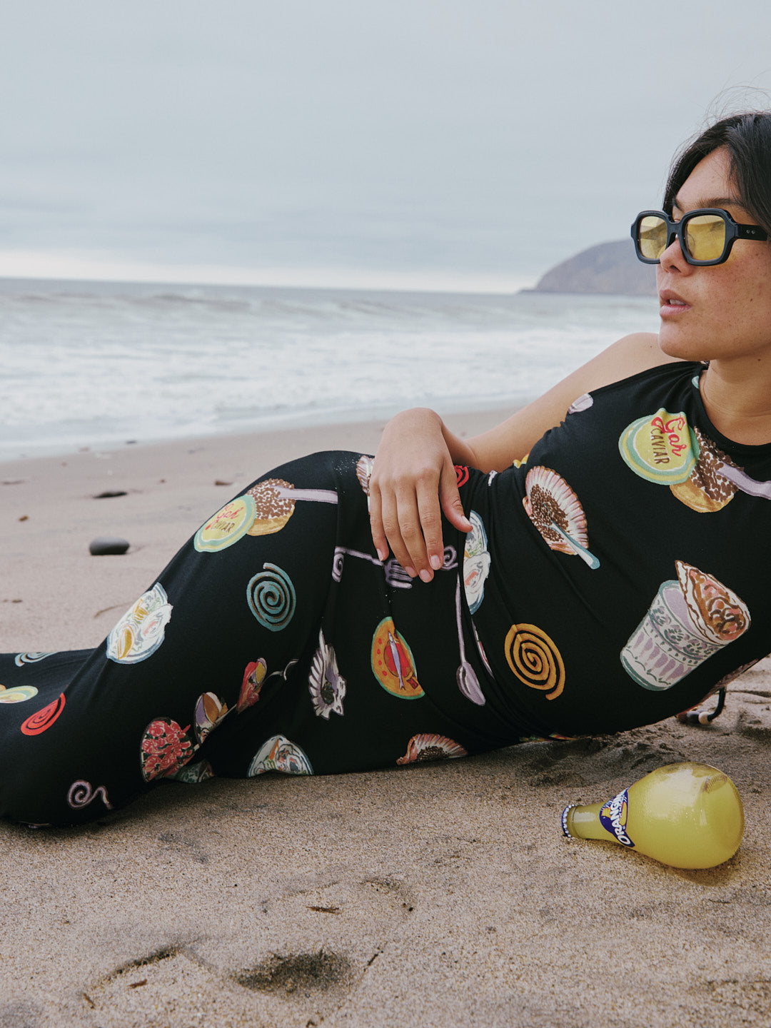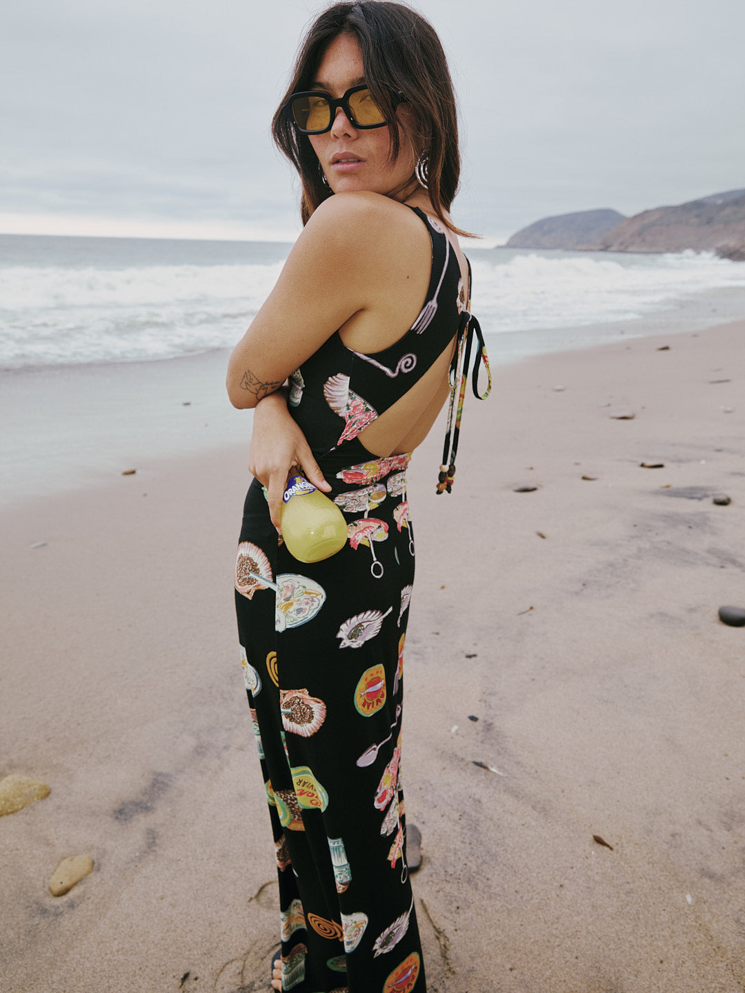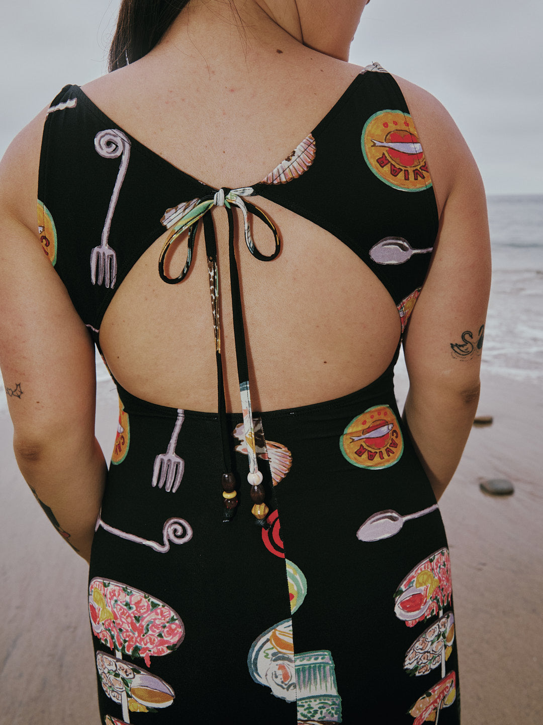 The Maya dress is a form fitting dress with an open, low back featuring a tie at the top of the back with wooden bead details and a zip closer at back. Featured in our signature Caviar Dreams print.