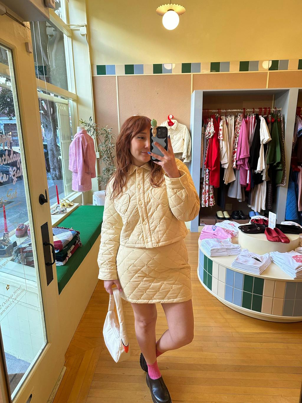This skirt is so fun and puffy, I feel like it looks best as a set with the Tiffany Jacket! The quilting is really good and has hidden shapes in it. The shape of the skirt is very simple, fits about mid-rise and is fitted through hips. I have wider hips (41 inch) and the large works for me.
