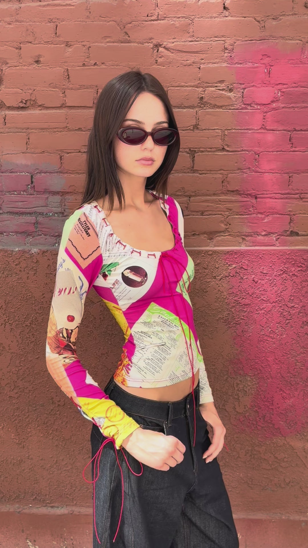 A sweet statement with a lace-up edge. The Menu Long Sleeve features a collage of menus. The scoop neckline is framed with eyelet lacing and a delicate tie at the center front, echoed by matching ties at the sleeves. Fitted through the body and arms, this top balances romantic detail with a sleek, sculpted shape.