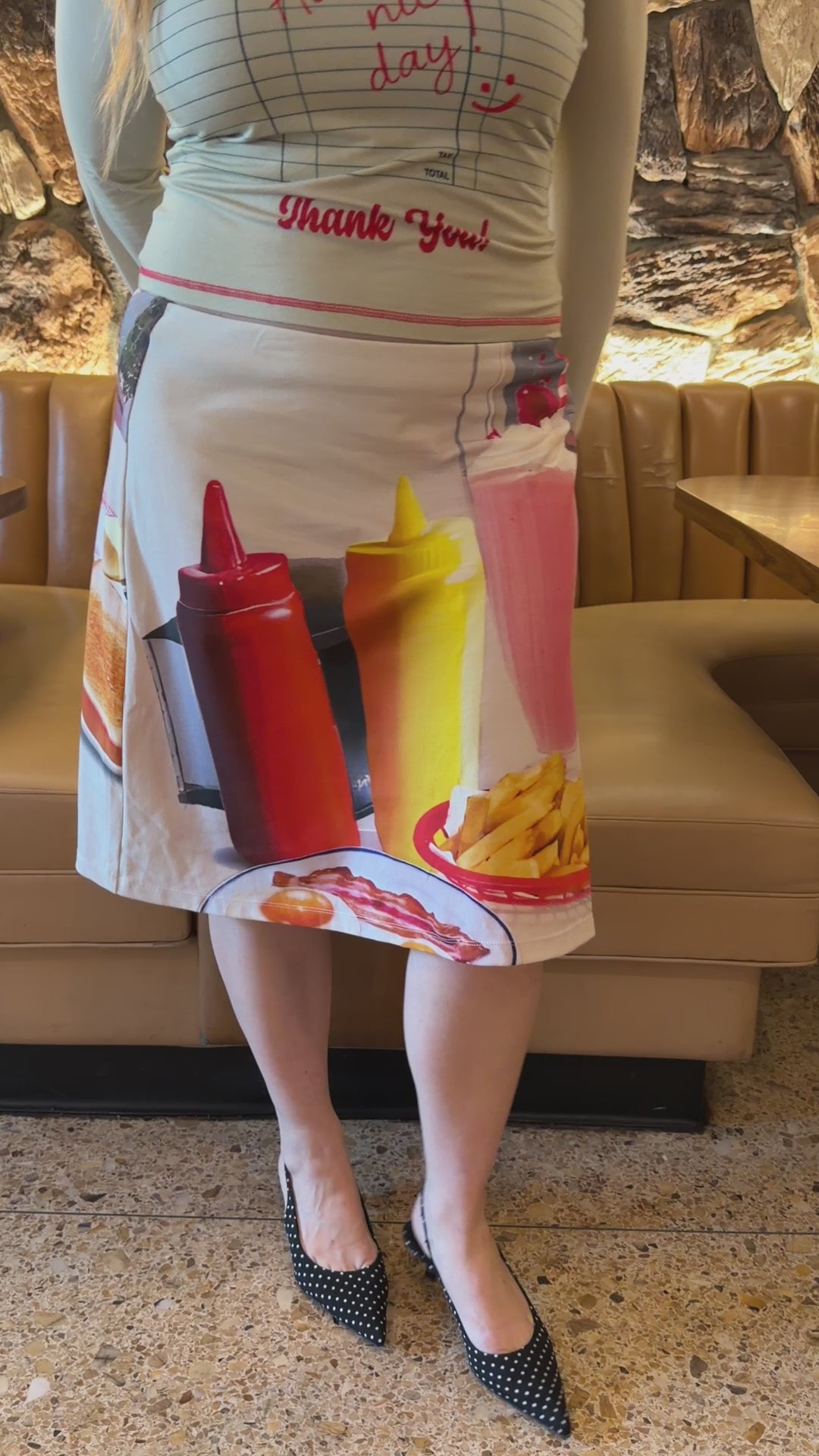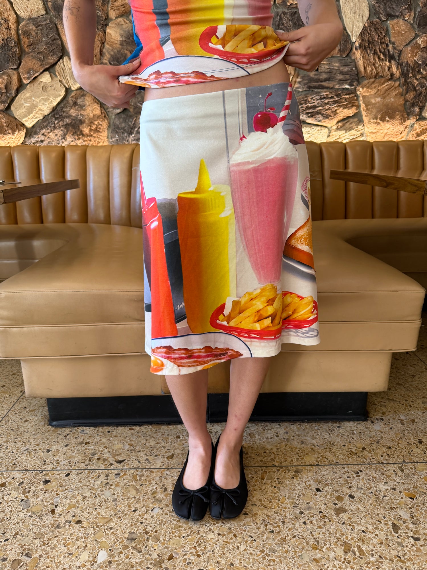 A picture perfect diner print with classic American favorites. The most comforting sunny print to take you from breakfast to late nights. Designed to sit on the hip with an A-line fit and cut in a soft, breathable cotton jersey.