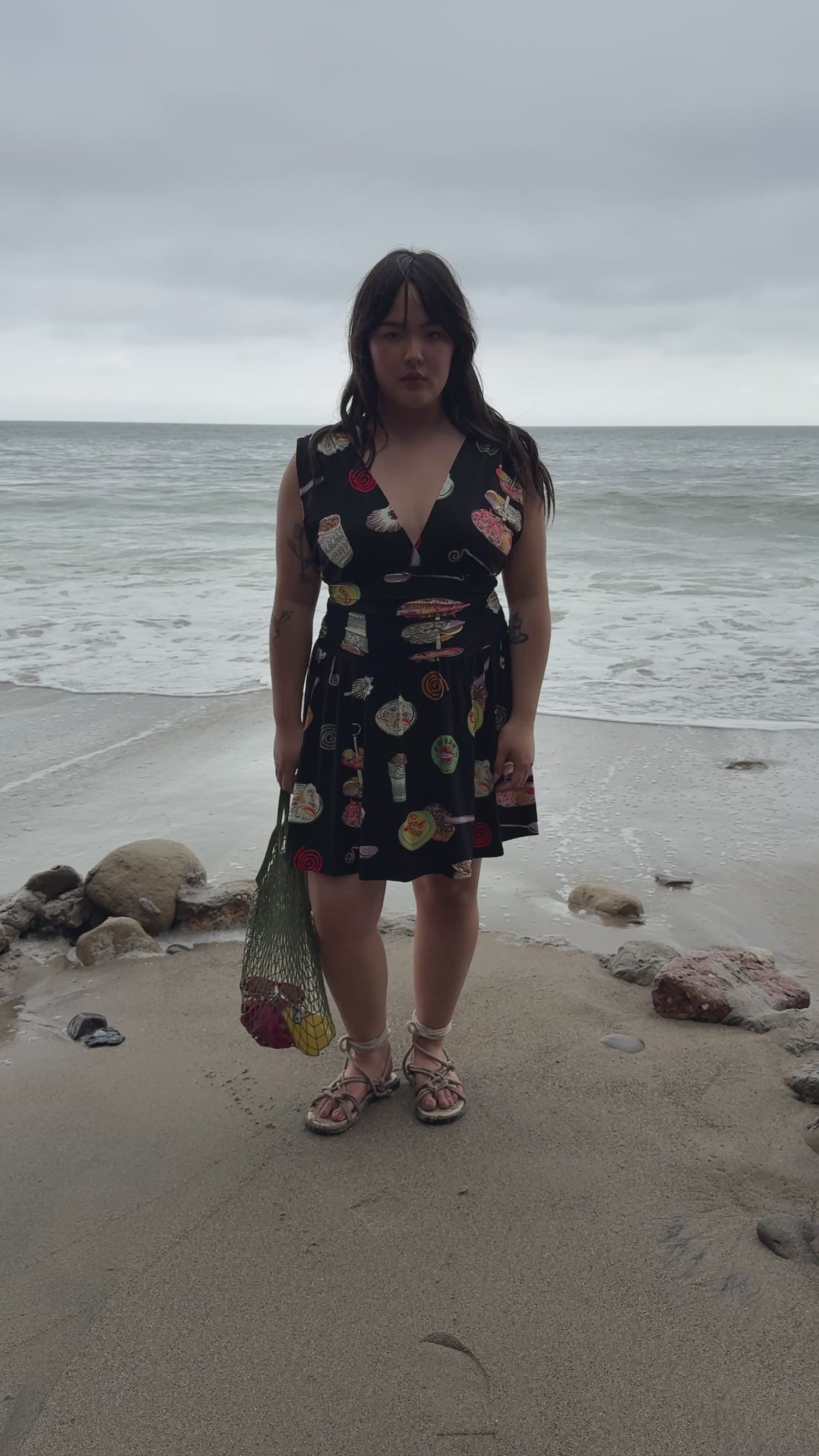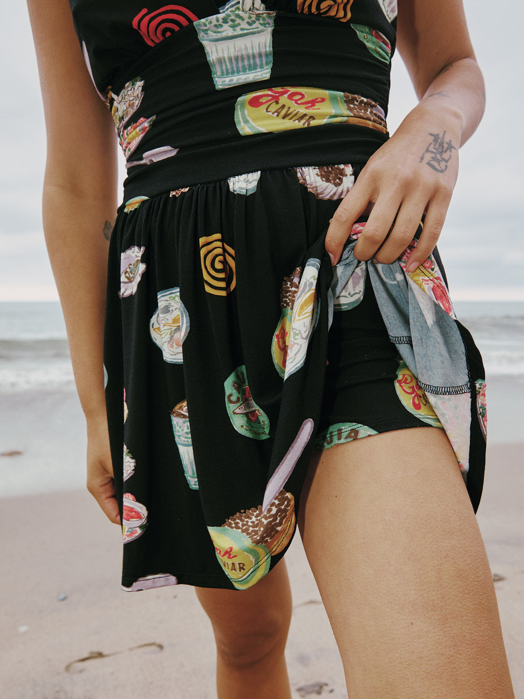 A mini dress with a plunge neckline and a ruched waist. Featured in our signature Caviar Dreams print on a comfortable jersey fabric with stretch. This dress has built-in shorts for a comfortable fit.