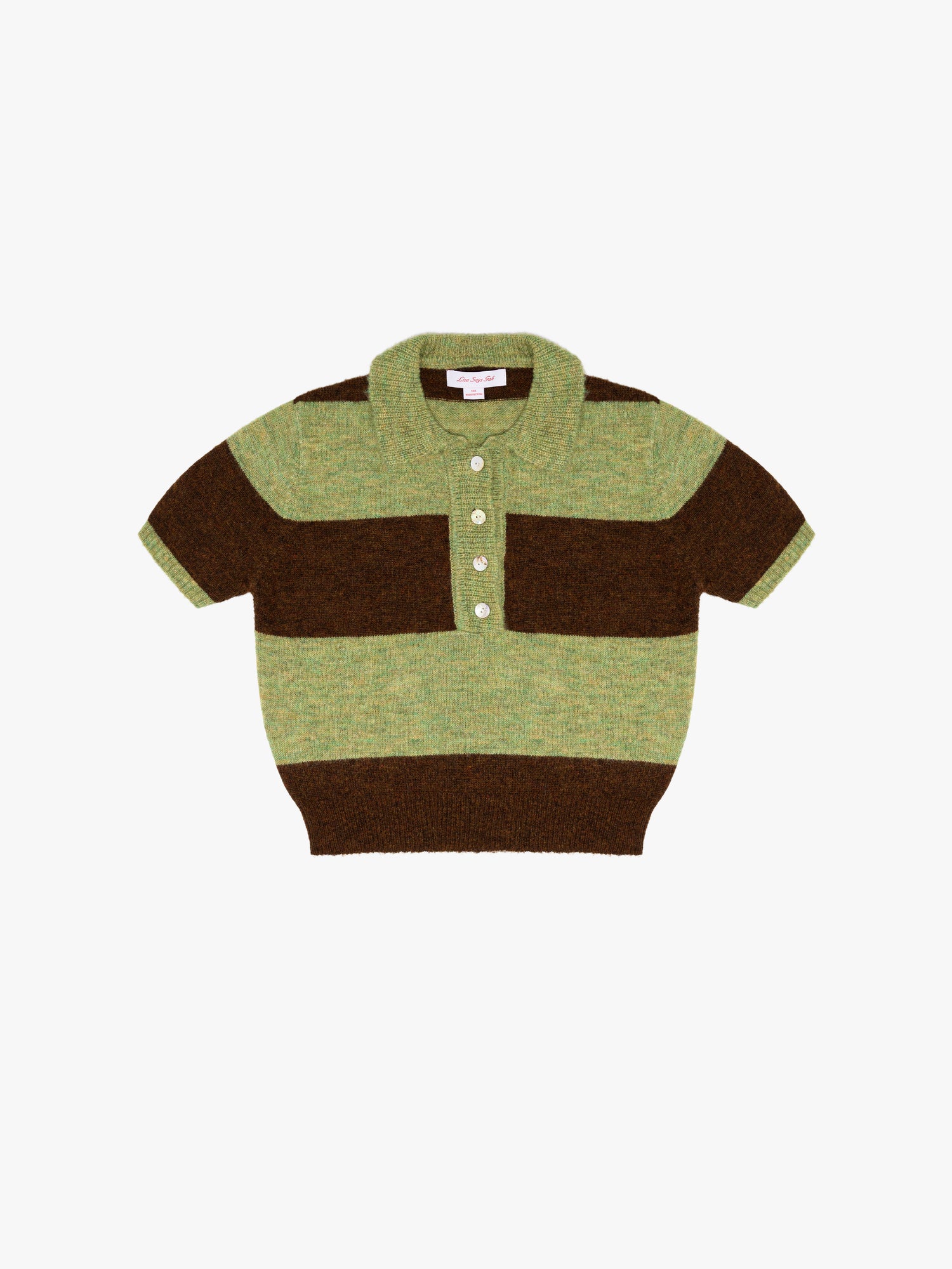 Introducing the Molly Polo Sweater: This short sleeve take on our best-selling Alaia Sweater is the perfect transitional piece for fall. This wool blend polo sweater features a pistachio and mocha stripe print, ribbed trim on the sleeves and bottom hem, and functional buttons.