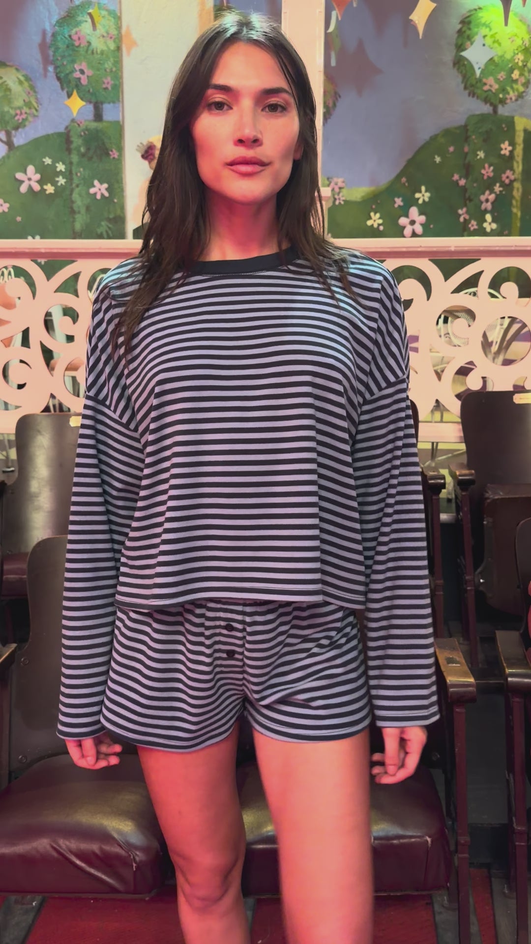 The Mona Long Sleeve is a cozy striped crewneck top from Loucia. Perfect for lounging around and just in time for the cold seasons. Featured in a stretch fabric and super soft to the touch. Match it with the Mona Short.